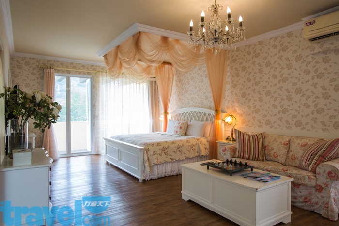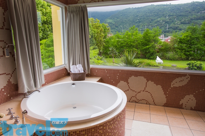 「花見幸福」最棒的一間房是「蜜月套房」,走維多利亞風,玫瑰花壁紙、床 罩、花布沙發,浴室鑲上玫瑰花馬賽克 磁磚,還有一個面湖的圓形浴缸,浪漫指數百分百,「總要創造一個話題」珊珊說,果然是當過飯店公關很有概念。