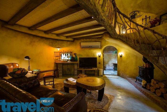 走進屋內,圓形的空間就像童話裡的小屋一般,而內部細節更是看得出主人的講究,為了彩繪出漂亮蘑菇色的牆面,珊珊找來的不是油漆工而是畫布景的師傅,坐起來很舒服的仿舊皮沙發也很有質感,最有趣的是浴室,營造出像在山洞裡洗澡的感覺,非常有原始味。