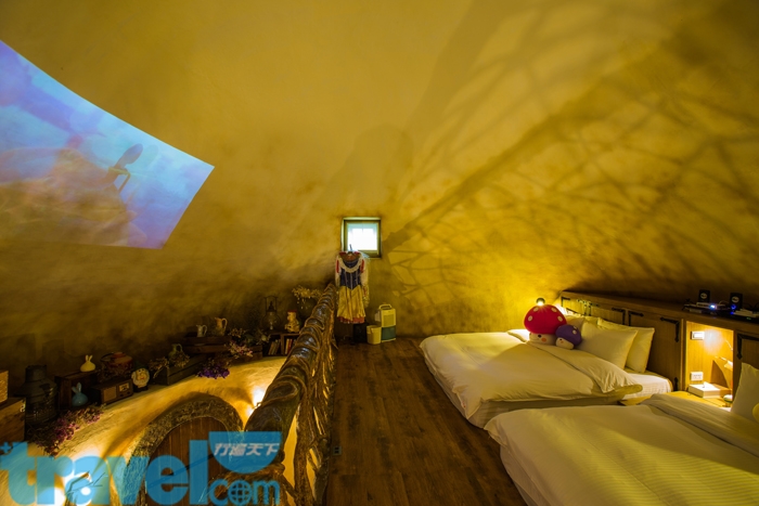 走上二樓才是臥房,弧形天花板給了珊珊可以做成星空電影院的構想,旁邊還準備了童話人物的服裝,就是要讓客人整個沉浸在童話世界裡,還有為蘑菇屋客人特別準備的拉拉熊下午茶組,如果入住蘑菇屋可別錯過午茶時間。