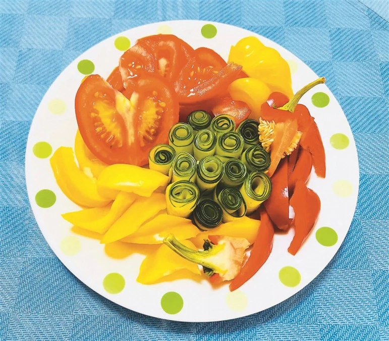 - 將小黃瓜洗淨去頭尾,用削皮刀刨成長條薄片,捲成筒狀,排盤;紅番茄,紅甜椒、黃甜椒切成適口的塊狀,蓋上保鮮膜,放入冰箱冷藏冰鎮備用。