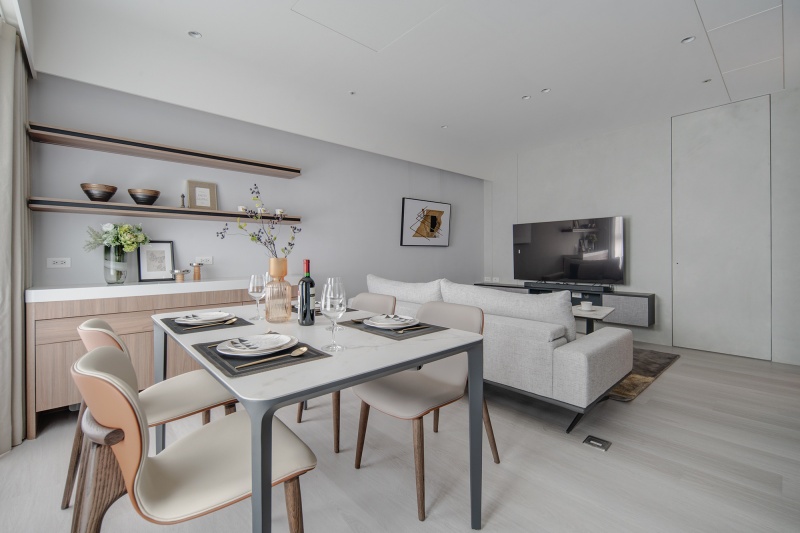 - 場域串聯:以開放式格局整合玄關、客廳、餐廚,使公領域連貫流暢,提升視覺延展性。