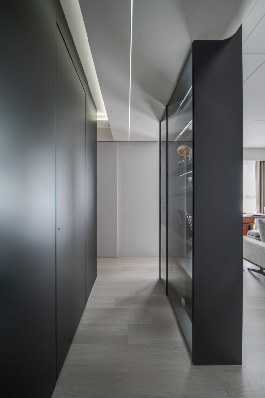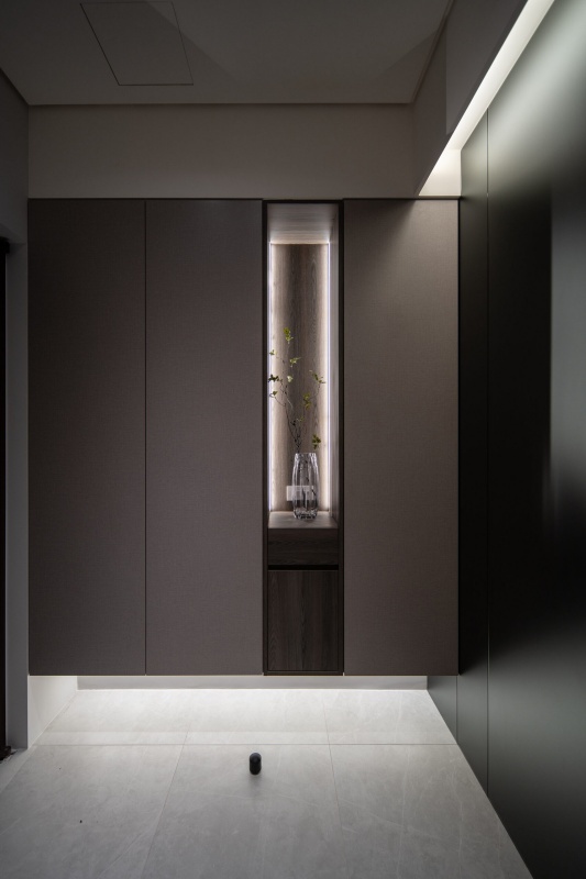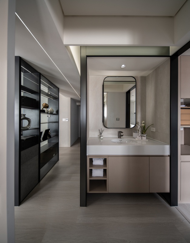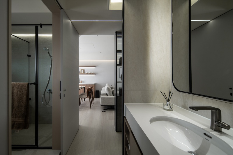 - 門體隱匿:全室採無框暗門設計,門片隱入牆體,形塑俐落純粹的牆面語境。