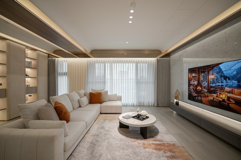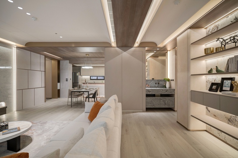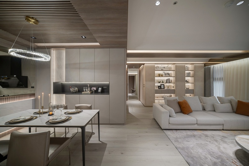 - 連動照明:展示櫃與客廳採共通光源設計,整合氛圍燈效與機能照明,強化空間連結感。