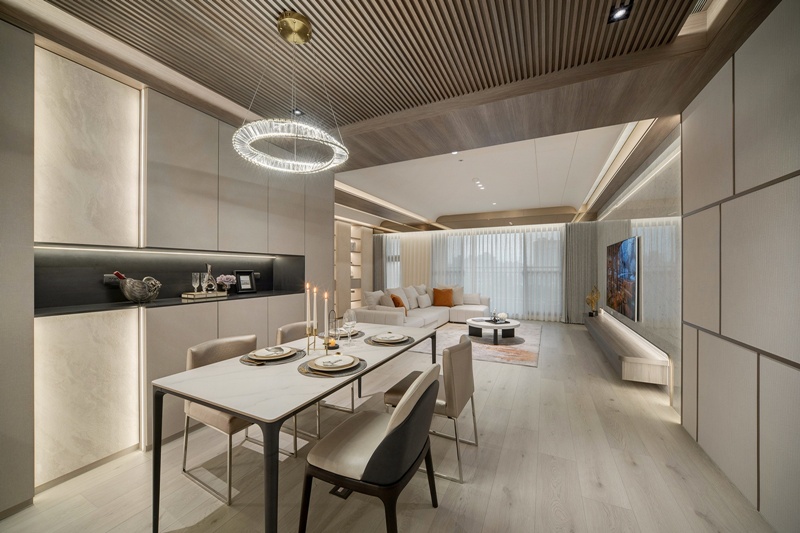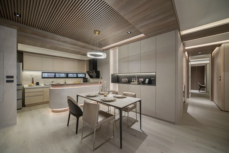 - 情境燈飾:餐區配置圓弧水晶吊燈與局部投光照明,烘托用餐氛圍,成為視覺端景焦點。