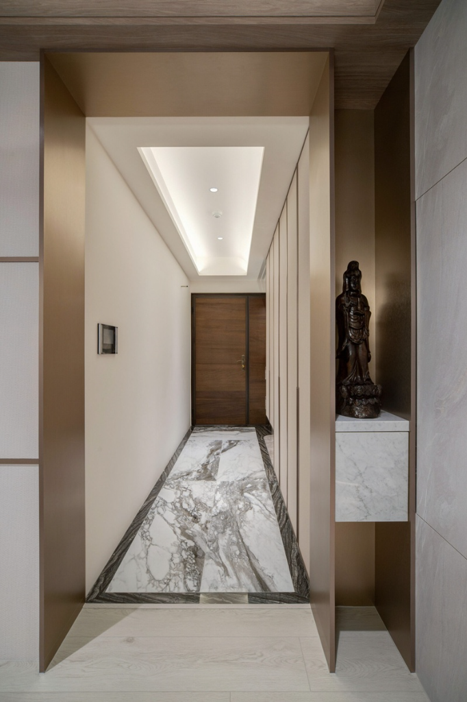 - 儀式迎序:玄關沿著廊道延展,地坪鋪設天然大理石,營造從外至內的轉場儀式。