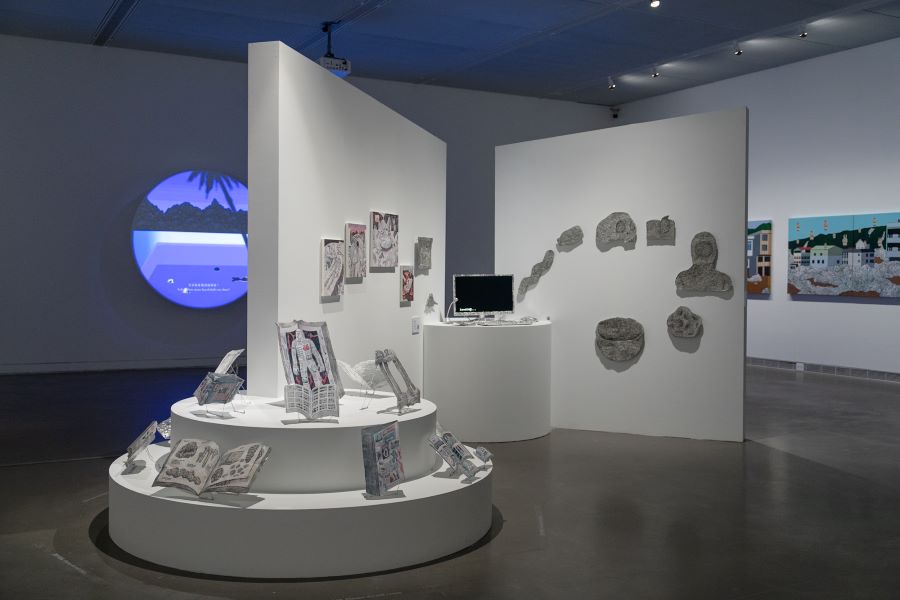 與此同時,林慶芳結合了童年回憶的巨大尪仔標、張恩慈以迪士尼公主電影場景為靈感發想的新作〈無限重播〉,以及林佩穎宛如內在呢喃和剪貼本般童趣交織的拼貼手法,接力呈現圖像記憶的再製與轉譯。倪再沁〈超超扁平〉系列展現其對日本動漫與普普藝術的觀察與反諷,而李明則耗時7年所繪巨幅作品〈走自己路的〉堆砌出融合大眾與在地視覺文化特色的史詩畫卷。