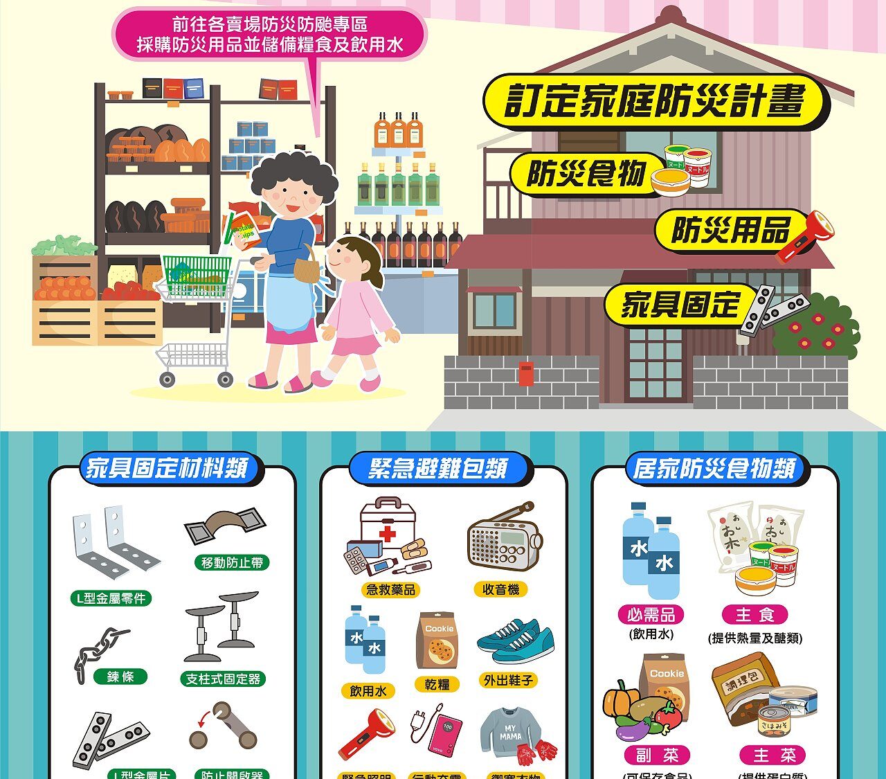 〔News586/記者郭政隆嘉義市報導〕臺灣位處在高災害風險之地區,經常面臨颱風、地震、淹水、土石流及疫災等災害,為因應上述情況發生,民眾應平時就做好各項防災準備,確保災時生命財產安全;經統計,每年7月至9月為「颱風季」,此期間為颱風頻繁來襲之時節,亦為臺灣帶來豐沛的雨量,為避免颱風危害,為使市民事前做好防颱準備,備妥防災食物、防颱用品等項目,內政部協調多家賣場,季節性陳列設置「防颱專區」,推廣落實市民自主防颱準備,讓市民在日常購物之餘,能夠順便檢查並補齊家中所需防颱物資,達成一次購足、防災無憂的目標。