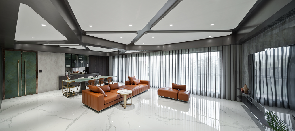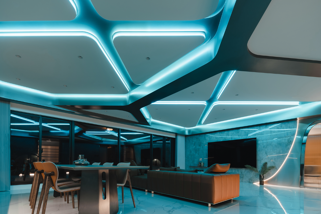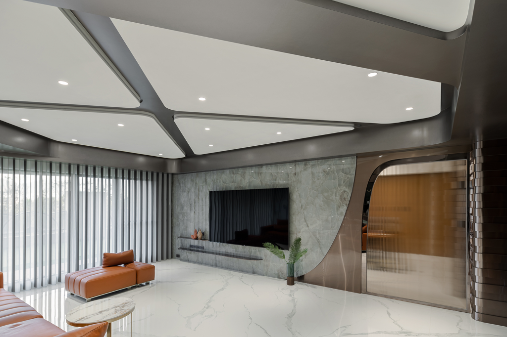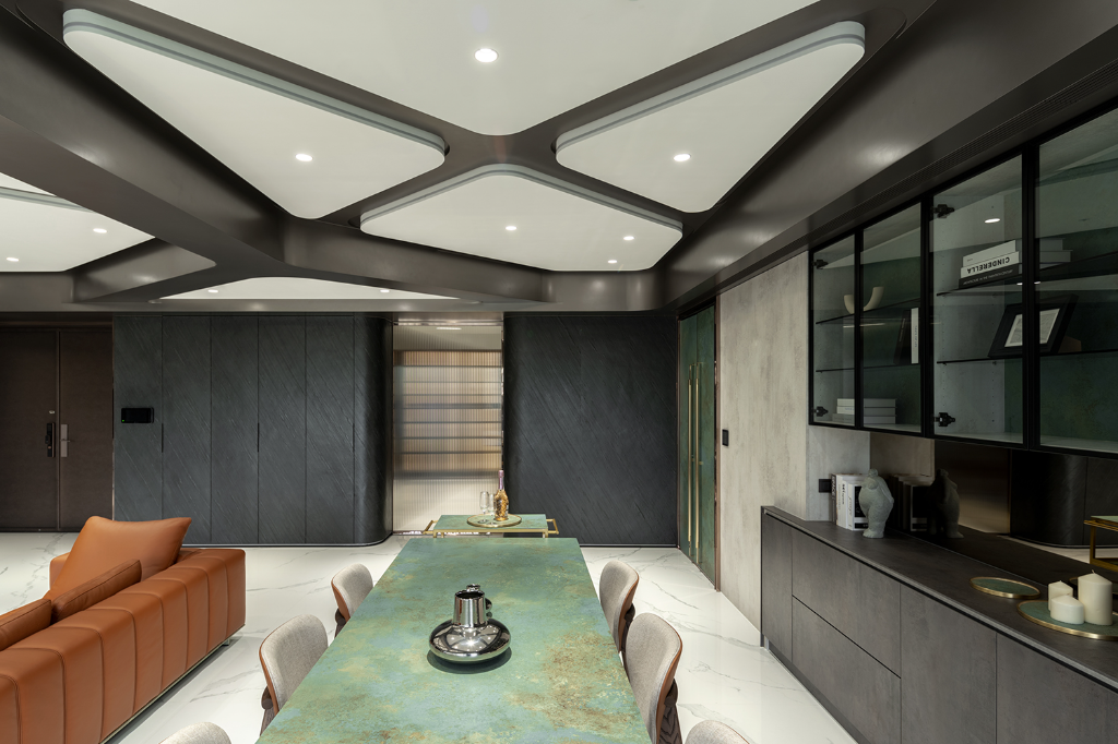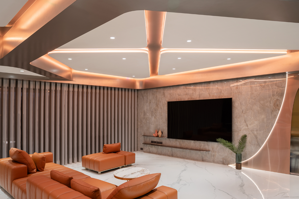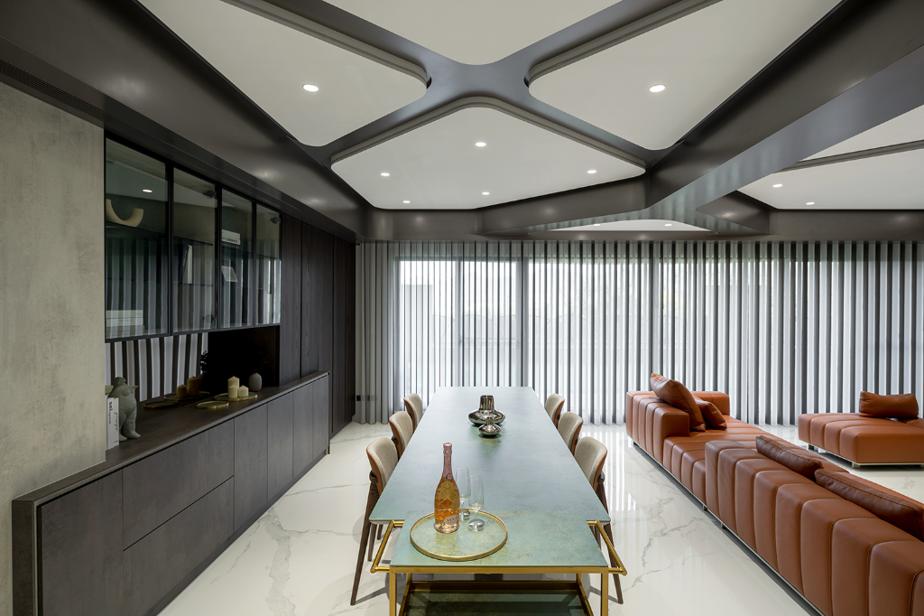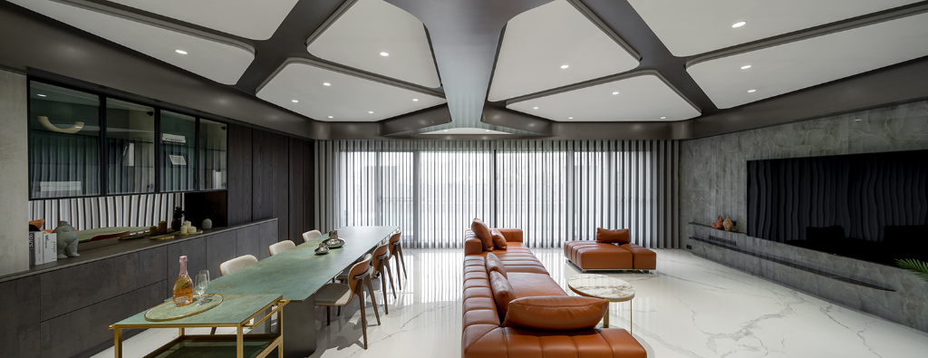 本案室內總坪數約140坪,交到設計團隊手上時為一毛胚屋,設計師大膽突破傳統界線,將客廳與餐廳打造成無隔閡的開放式場域,好滿足逢年過節親友聚會的社交需求。客廳的造型天花成為視覺焦點,以弧形金屬與透光板巧妙結合,取代傳統矽膠燈條,讓飽和的色彩均勻地穿透而出,精緻地灑落在金屬烤漆表面,且盡可能地減少接縫,使整體外觀更加細緻,不規則波動與起伏蘊含深刻鮮明的流動性,加上白色、藍色、黃色燈光渲染,更加突顯設計之美。同時精心安排的燈光系統藉由「側發光」技術呈現,隨心所欲地轉換氛圍,時而溫暖舒適,時而前衛摩登,彷彿將生活置於一場不間斷演出的光影劇場之中。