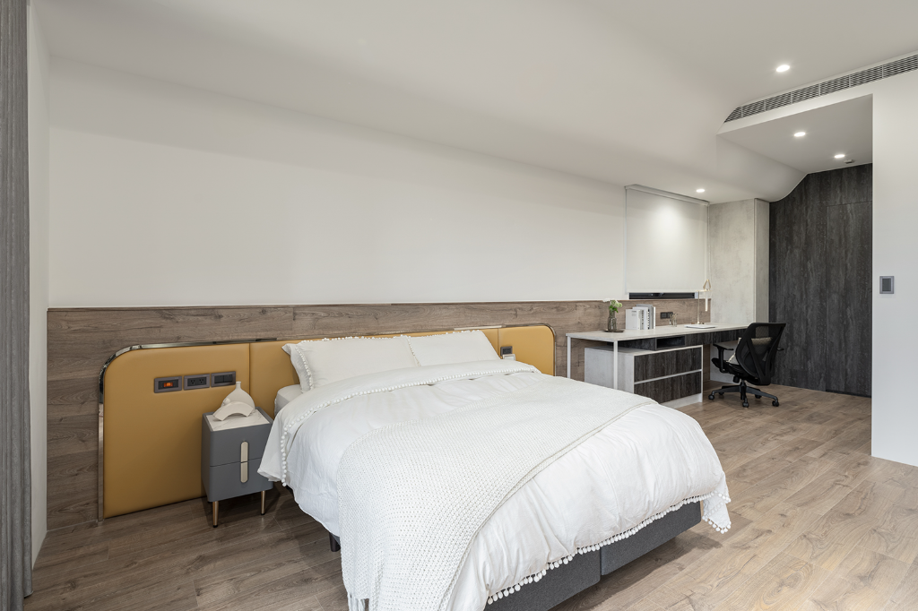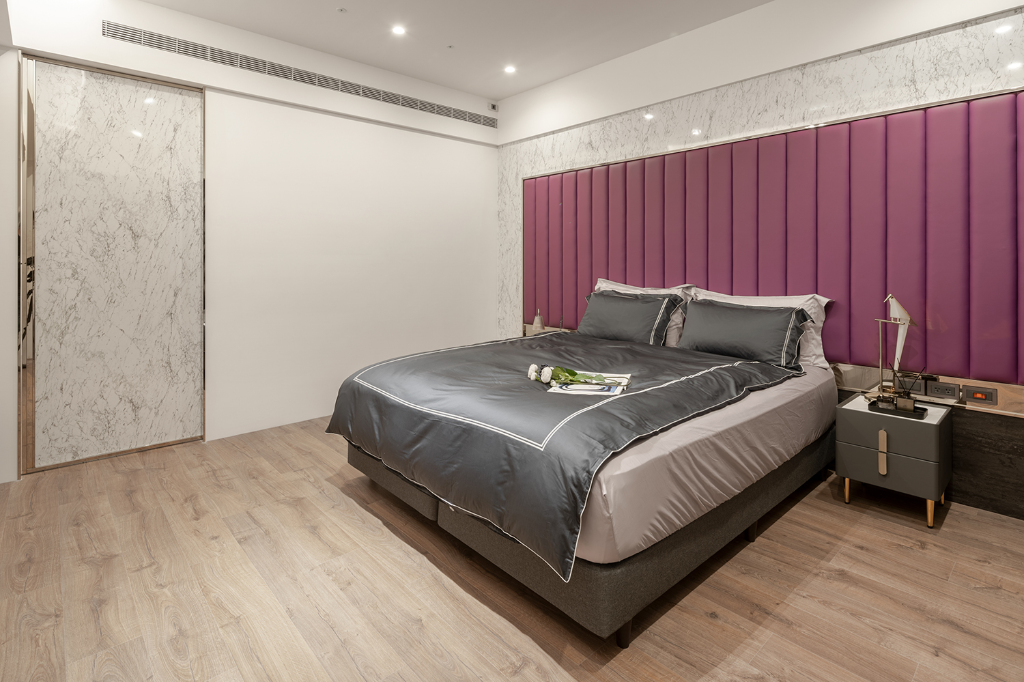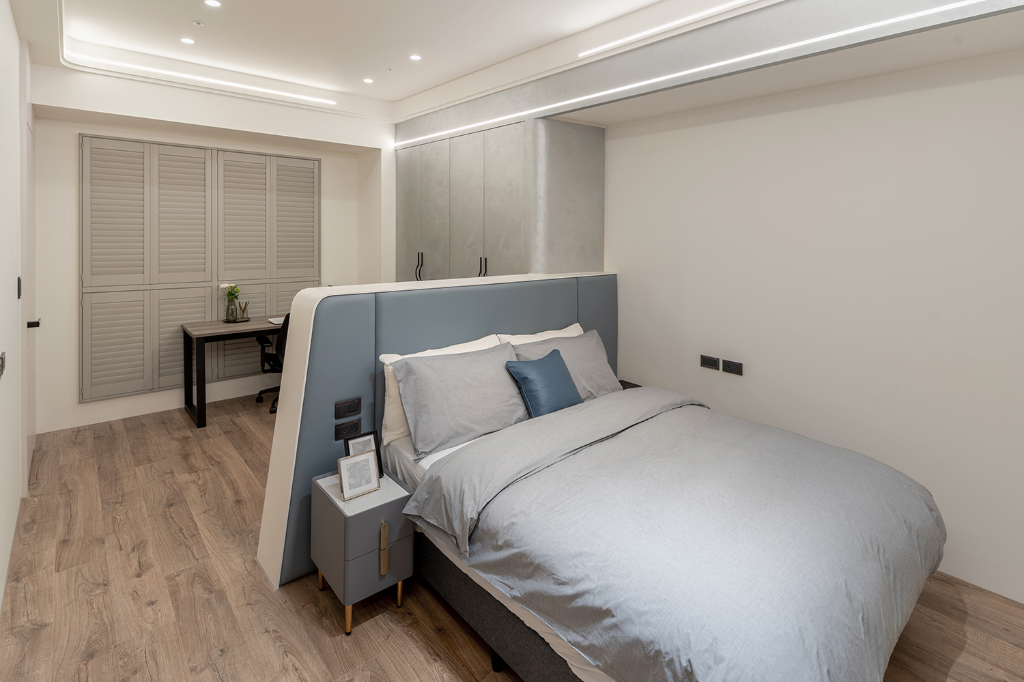 考量到家人作息與孩子成長需求,設計師將私領域劃分得極為細膩:男女主人各自擁有獨立的主臥室,與女兒房分別安排於公領域兩側,有效保障隱私與生活動線的順暢性。私領域特意選用溫潤木質調,充分形塑溫馨安穩的睡眠環境,提供家庭成員安然享受自我獨處的美好時光。