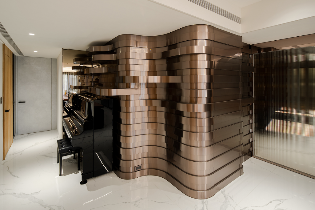 過道上的鍍鈦曲面以波浪曲線層層堆疊,創造出猶如藝術品般的視覺亮點,顯露低調內斂的高級光澤,刻劃出優雅流暢的弧線。由於鍍鈦材料對轉折角度要求嚴苛,這處設計考驗著鐵工師傅高超的技術與耐心,所幸最終呈現的效果令人屏息讚嘆,成功將建築外觀形態萌生的靈感,轉化為家中一隅的出色端景,成為賓客到訪時心目中難忘的驚豔風景。