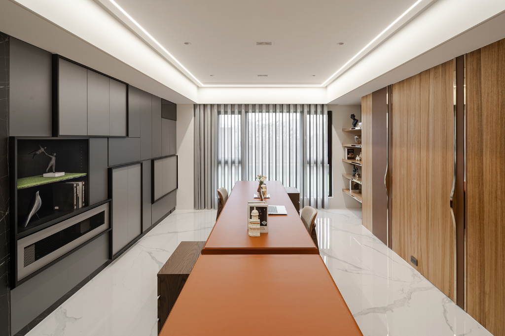 此外,為了加強家庭間的情感連結,設計團於是規劃一處可容納五米長書桌的明亮書房,成為全家人交流想法、徜徉書海的秘密基地。在這裡,親子之間的感情交流尤為頻繁,空氣中流動著溫馨氣息,成為日常生活中無比珍貴的美好記憶。