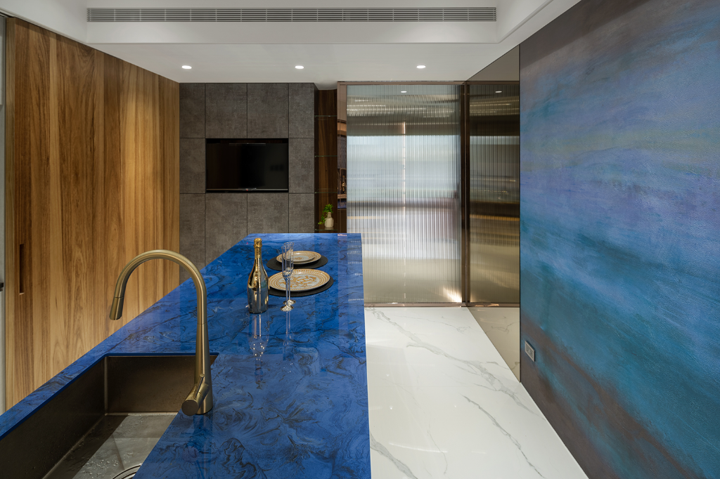 住家內使用的多元建材更蘊含貼心巧思:鍍鈦金屬、金屬烤漆大量使用於天花與壁面,散發現代輕奢氛圍;餐桌、吊櫃及主臥門片選用形似抽象畫的義大利瓷磚,營造充滿藝術氣息的個人風格。公領域地坪則採用大尺寸瓷磚,俐落外觀除了避免不必要的切割線條,更進一步形塑整體空間的簡約大氣。而廚房特別選用藍色調的檯面與壁面,運用獨到的紋理及色彩,讓整體視覺層次與識別度大幅提升,讓人猶如置身於高級藝廊內,從內心升起對美好生活的嚮往及追求。