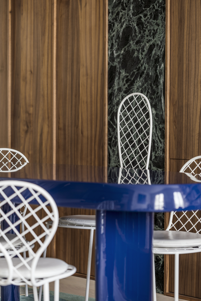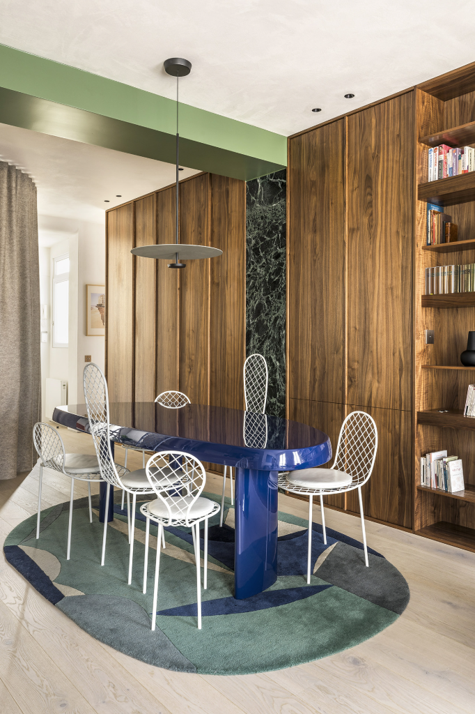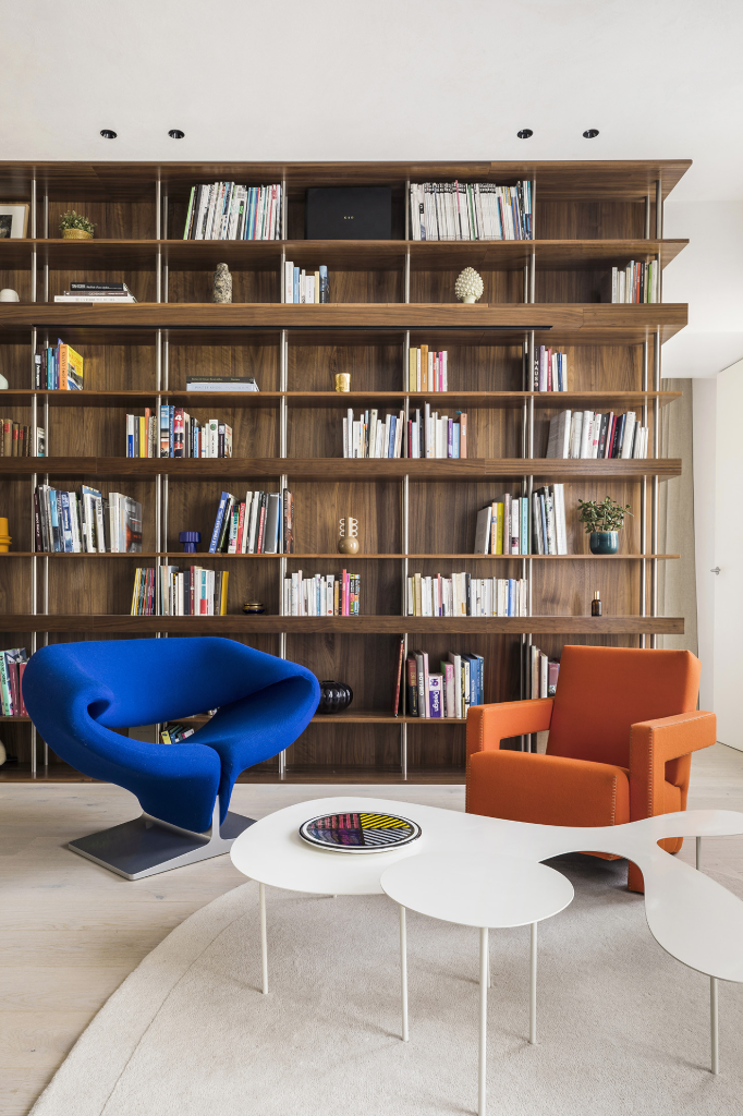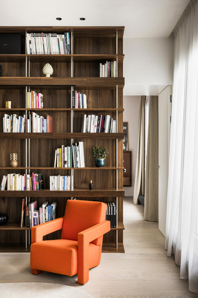 不同場域之間的分隔,由一條橫跨東西向的胡桃木構造加以串聯,木質軸線內包含洗衣間、收納櫃、書架與家庭影院等功能性設施,如靜默的脈絡,巧妙劃分日夜的同時,也讓視覺流動不受干擾。居家書房設有可完全圍合的環形毛氈簾幕,不僅具備隔音效果,亦能將此處轉化為臨時客房;當簾幕敞開,則回歸開放狀態,得以舉辦熱鬧的晚宴聚會,展現多元實用彈性。