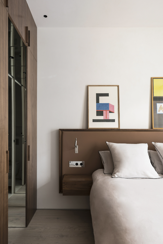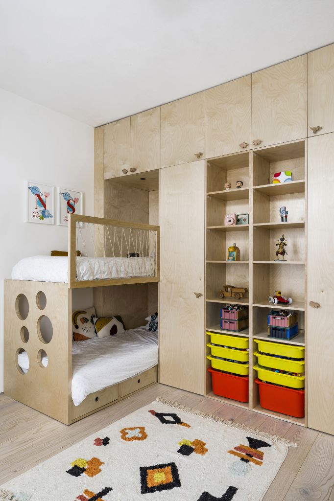 兒童房則以膠合板量身打造上下舖、收納櫃與書架,形塑出一個童趣盎然、實用並重的專屬天地。設計在簡潔中蘊藏巧思,彷彿為日常留白,也讓孩子的創造力自然展開。照明部分選用Flos、Vibia、Wever & Ducré等歐洲設計品牌,家具則融入Cassina、Artifort與Living Divani的經典設計,細節之中皆可見對質感與美感的堅持。