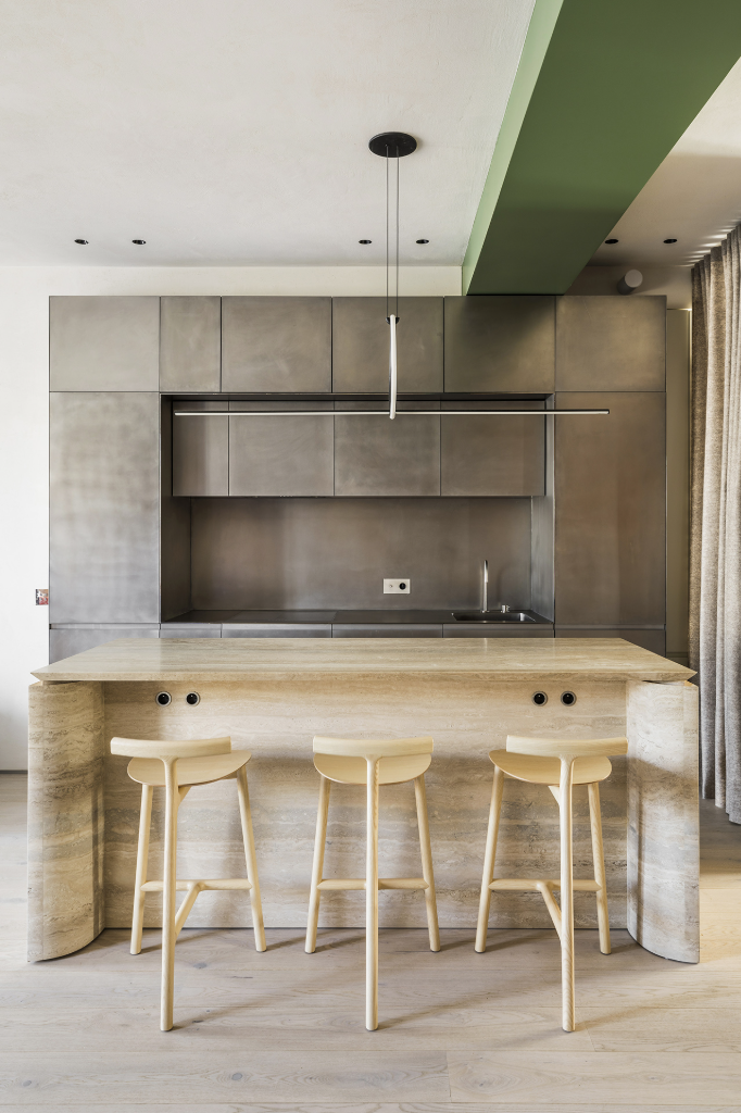 在材質選擇上,整體以天然石灰塗料鋪陳牆面,不僅有助空氣品質與濕度調節,更營造出溫潤柔和的氛圍。廚房則選用亂紋不鏽鋼面板,有效抵抗指紋沾染,保持歷久彌新的狀態,中島採用淺色洞石材質,與淡色木地板協調呼應,讓視覺保持輕盈純淨。書牆與主臥沿用胡桃木與不鏽鋼材質,於冷靜中注入溫度,使住家兼具理性結構與感性溫度。