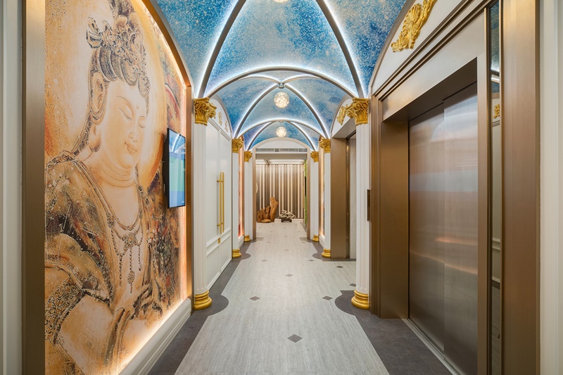 ●觀音洗光:壁畫兩側隱藏洗牆燈,3000K暖光勾勒輪廓,營造柔和與安定的空間表情。