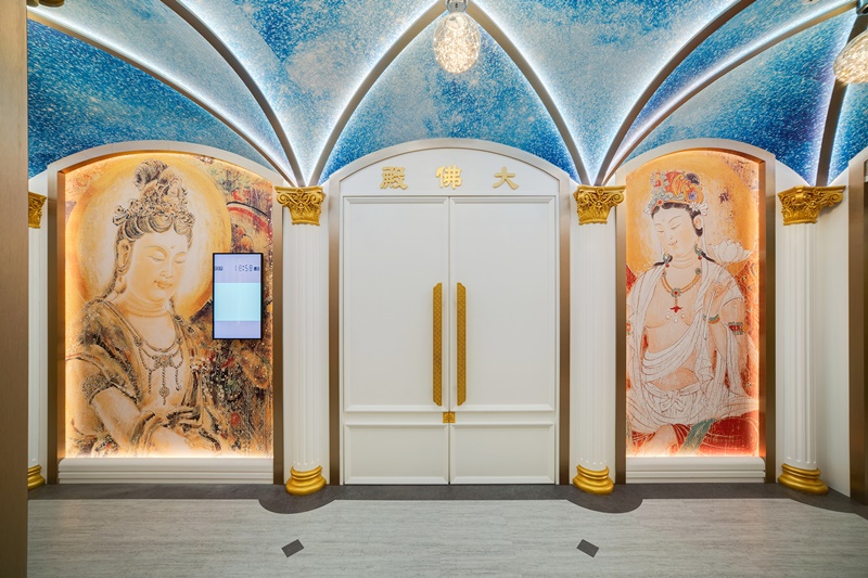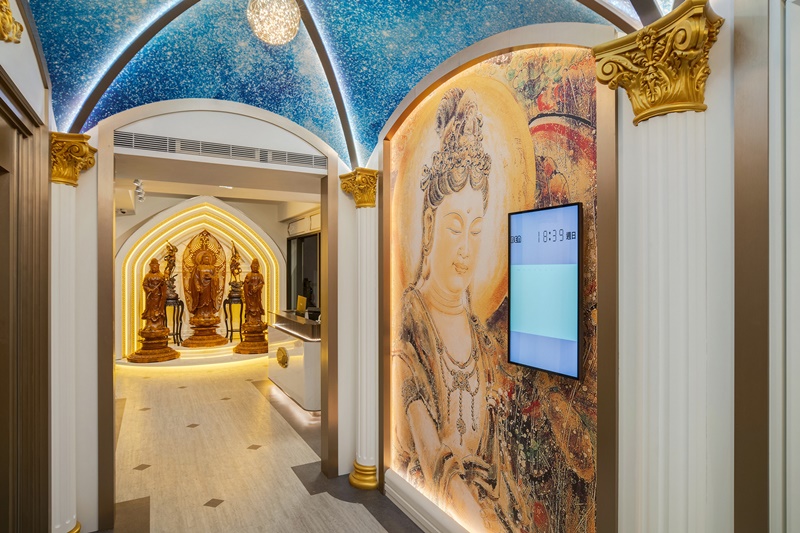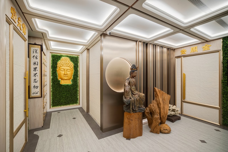 ●佛像光圈:主牆設雙層嵌燈,採 2700K 暖白光包覆佛像背板,營造內斂慈祥的氛圍。