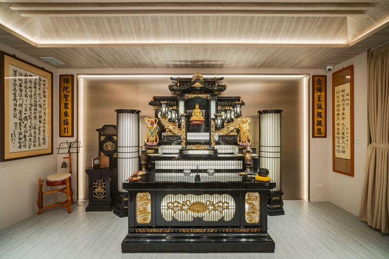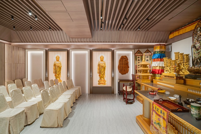 ●動線遞進:動線自接待區逐步引導至主祀佛堂,採前寬後深配置,營造儀式遞進的空間節奏。