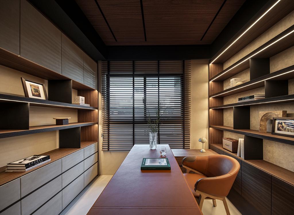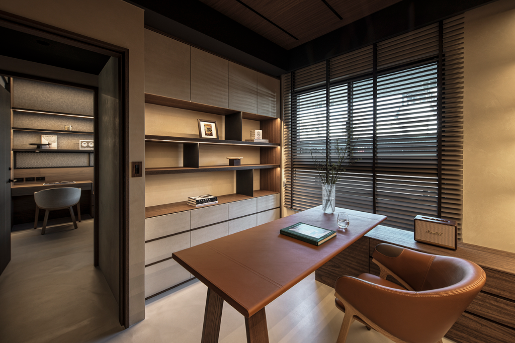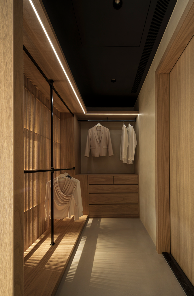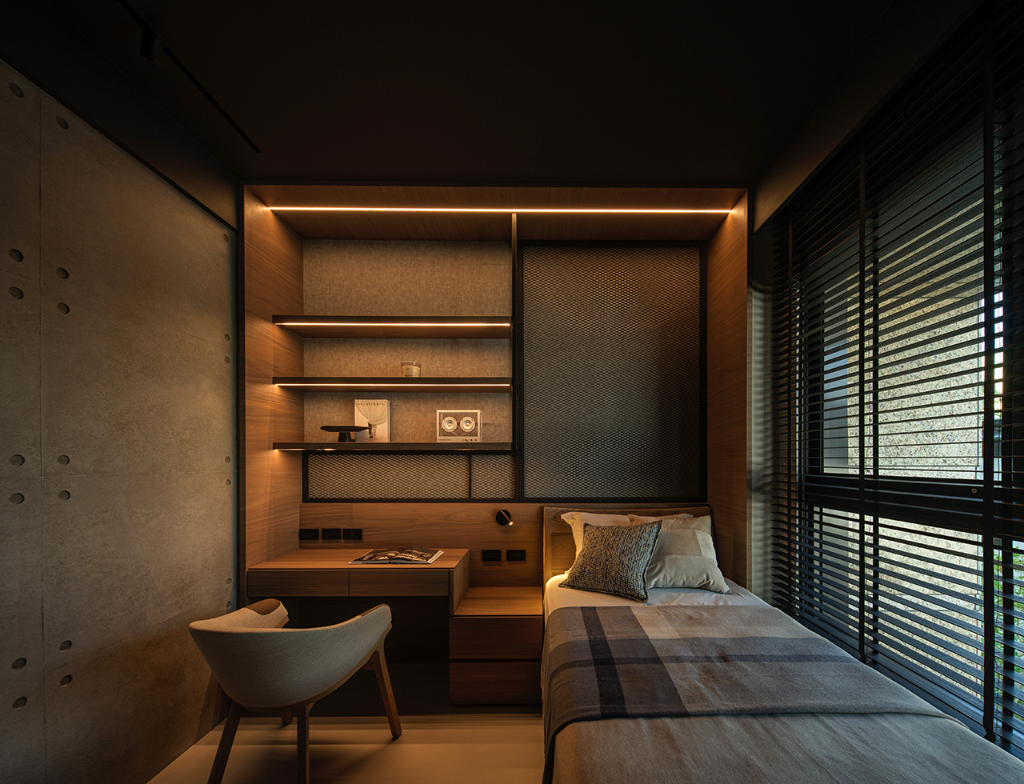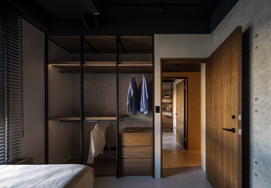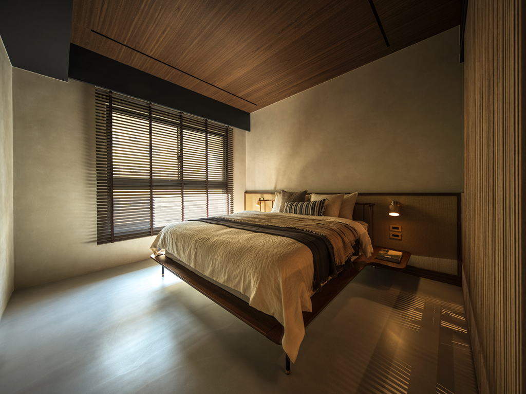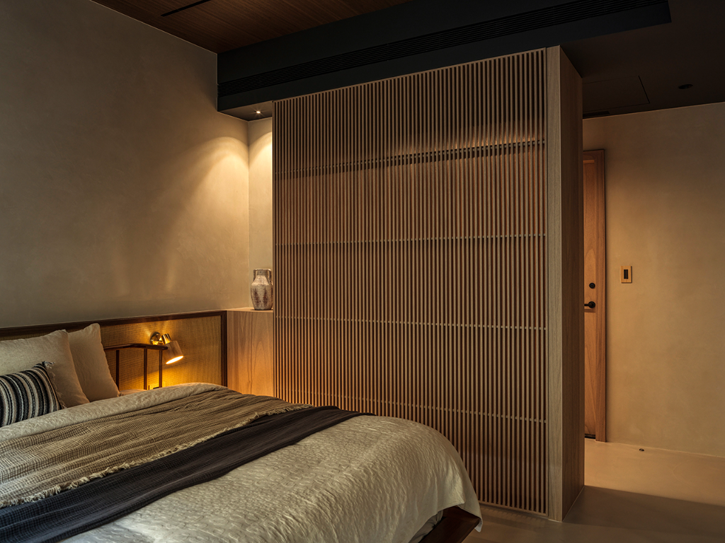 主臥更衣室巧妙整合收納與美感,運用木格柵設計,垂直線條呼應平行線條的木百葉窗,也對話玄關木格柵,光影流動中展現靜謐感。書房則延續公領域設計語彙,創造思緒流轉與心靈沉澱的閱讀角落;此外,男孩房延續自然基調,牆面採用仿清水模塗料專業工法,鋪陳如建築大師作品下的大器剛毅牆面,黑色金屬網狀鐵件與木層板構築床頭及書桌展示牆,細緻燈束收邊,營造出俐落、安定且不失溫度的自然工業風空間。