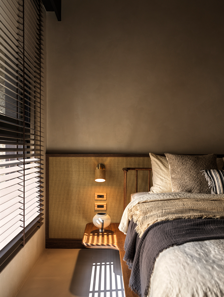 餐廳主牆另外使用了「Dune沙丘-銀點」金屬系列塗料,在溫潤木質與灰泥之間,注入礦石般的光澤感,讓整體空間在沉靜之中多了些層次與節奏;從木質橫樑裝點天花、實木百葉窗,到全室開關選用不同色澤紋路實木面板,處處展現對「自然」與「細節」的重視。同時刻意不隱藏天花吊隱空調,放大空間尺度,也呼應整體自然氛圍及粗獷調性。透過多元自然材質,讓人願意在此緩下步伐,與空間、自己靜靜相處,重新感受生活中最簡單而珍貴的寧靜片刻。