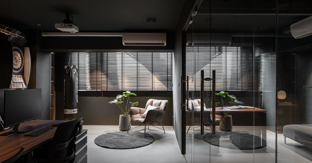 主管辦公室延續公共領域的暗色基底,描繪整體劃一的視覺風格,並以隔音良好的清玻立面劃分三處座位區,而各隔間交界處上方安裝的玄色調光簾,可依當下所需調整光線與遮蔽程度,確保設計師創作、思考時具有安靜獨立的個人角落;每一處細節皆回應實際使用需求,使整體辦公場域不僅是日常工作的場所,更成為激發創意、沉澱思緒的創作天地。