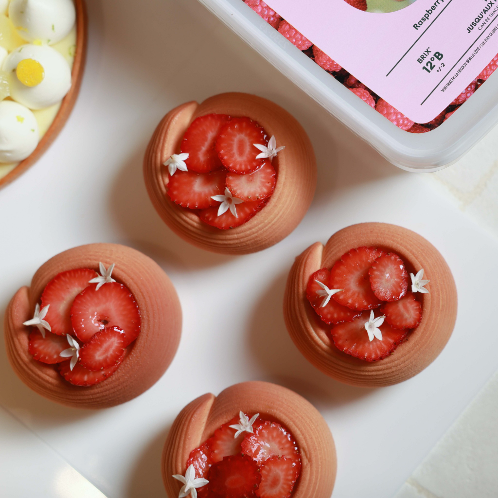 艾達曼冷凍覆盆子果泥調製內餡,融入濕潤蛋糕體與奶酥外層