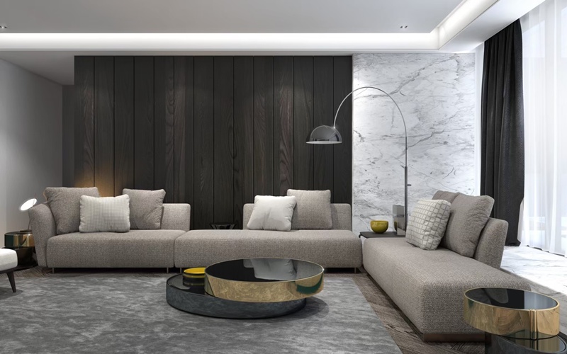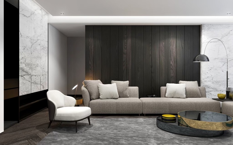 ●主牆設計:天然石材紋理交織深木與金屬語彙,構築客廳一隅的內斂奢雅。