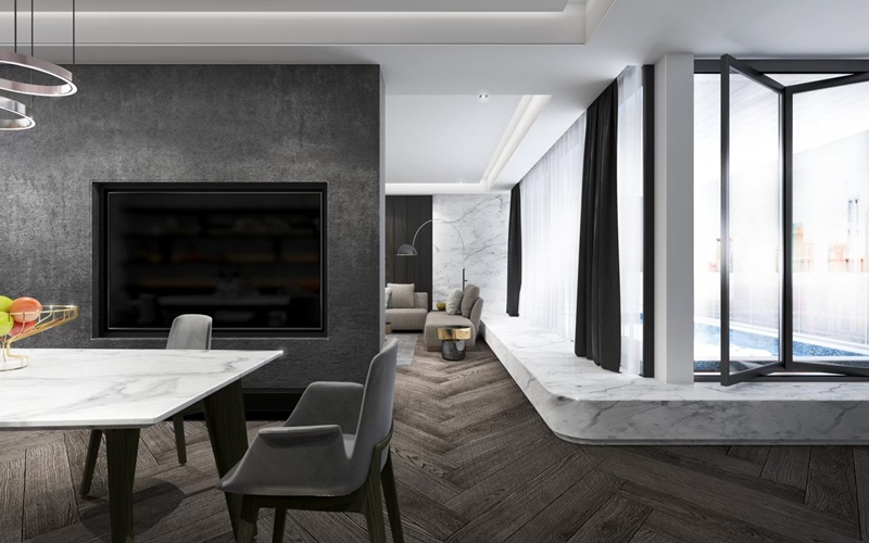 此案由深耕多年的豪宅設計師主導,結合台北室內裝修的高規格施作工藝,打造兼具美感與機能的現代美域。整體空間融合大量天然石材、深色木皮與鍍鈦金屬細節,鋪陳典雅大器的華美格調。設計團隊藉由重整格局比例,拓寬公領域互動尺度,同時守護私區寧靜,兼顧舒適及隱私;陽台泳池與景觀衛浴等休憩配置則化身都會叢林中的珍貴綠洲,賦予住戶心身和諧。全案展現新北室內設計推薦與台北室內設計推薦的高端實力,也是指標性的豪宅設計公司與新北室內設計實務案例之一。