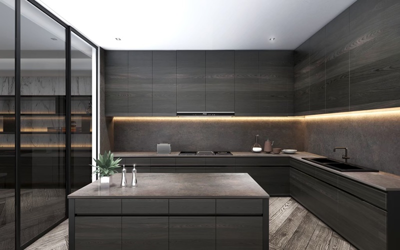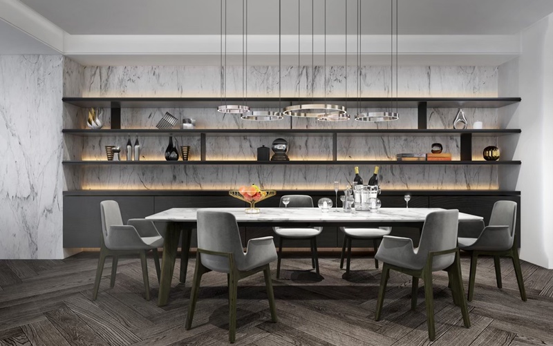 ●機能美學:餐區櫃體融合石材與烤漆工藝,實現美感與實用。