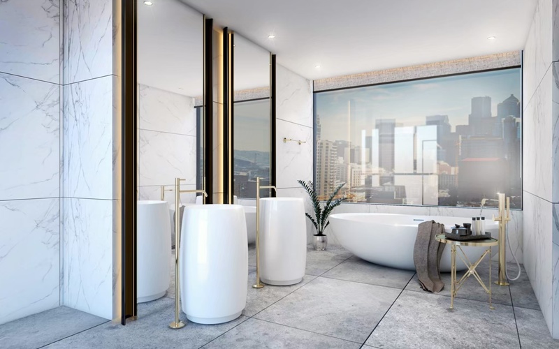 ●寬景衛浴:主衛浴大面石材搭配景觀玻璃,延展視野層次。