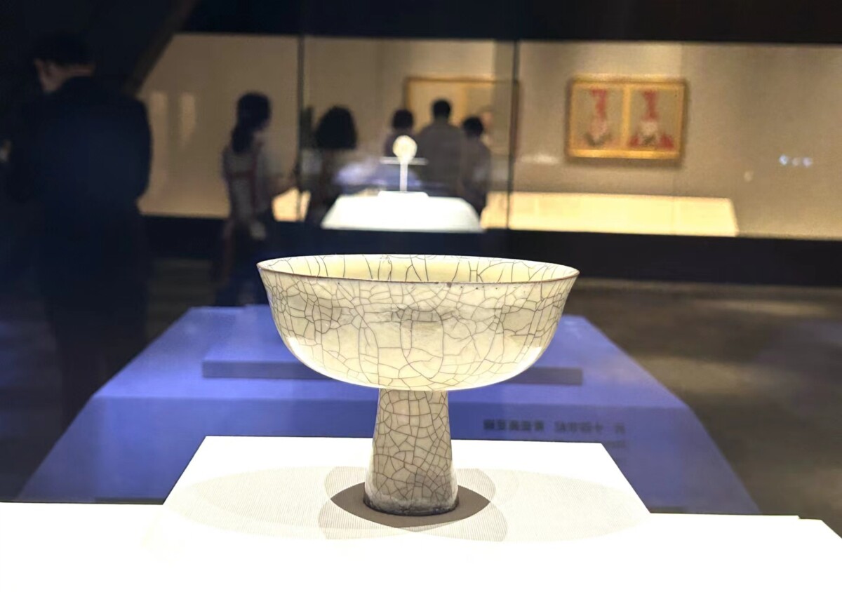 另一件展品為杭州老虎洞官窯所製〈青瓷高足碗〉,底徑寬闊、器足高挑,設計便於手持傳遞,反映蒙古草原飲宴文化;釉色深邃如藍寶石的〈霽青描金單把杯、托〉,造型為蒙古所特有,紋飾則融合中原與伊斯蘭藝術風格;〈青花葫蘆式把壺〉、〈青花花卉紋蟠螭方罐〉與〈人物紋玉壺春瓶〉等青花瓷器,展現元代青花裝飾的創新精神,並引領風潮,遠銷東南亞、中東與中亞地區,掀起一波燒造熱潮。