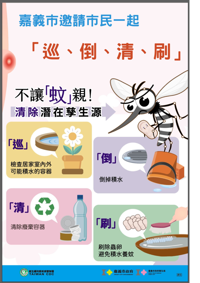 環保局長李佳禾提醒市民,雖然化學防治噴藥可降低環境中病媒蚊密度,但進行病媒蚊孳生源清除才是登革熱防治的根本,呼籲市民們把握「巡、倒、清、刷」四個原則,「巡」就是巡視周圍環境;「倒」就是倒掉積水容器;「清」就是清除廢棄容器;「刷」就是刷洗容器內壁清除蟲卵,只要大家做好孳生源清除,就可以阻斷登革熱病毒的傳播。