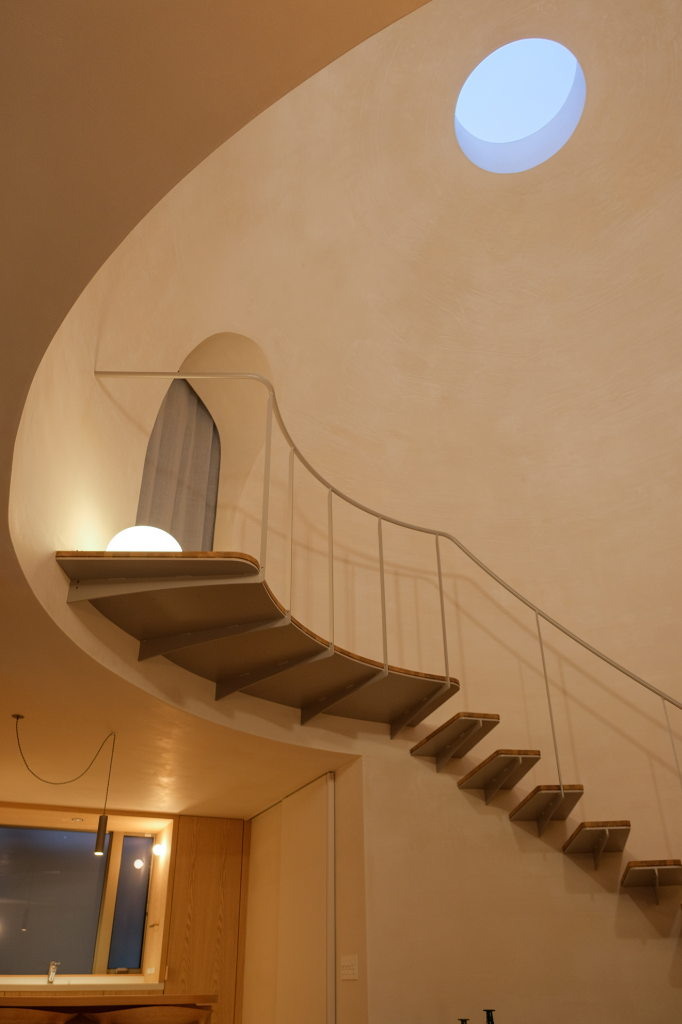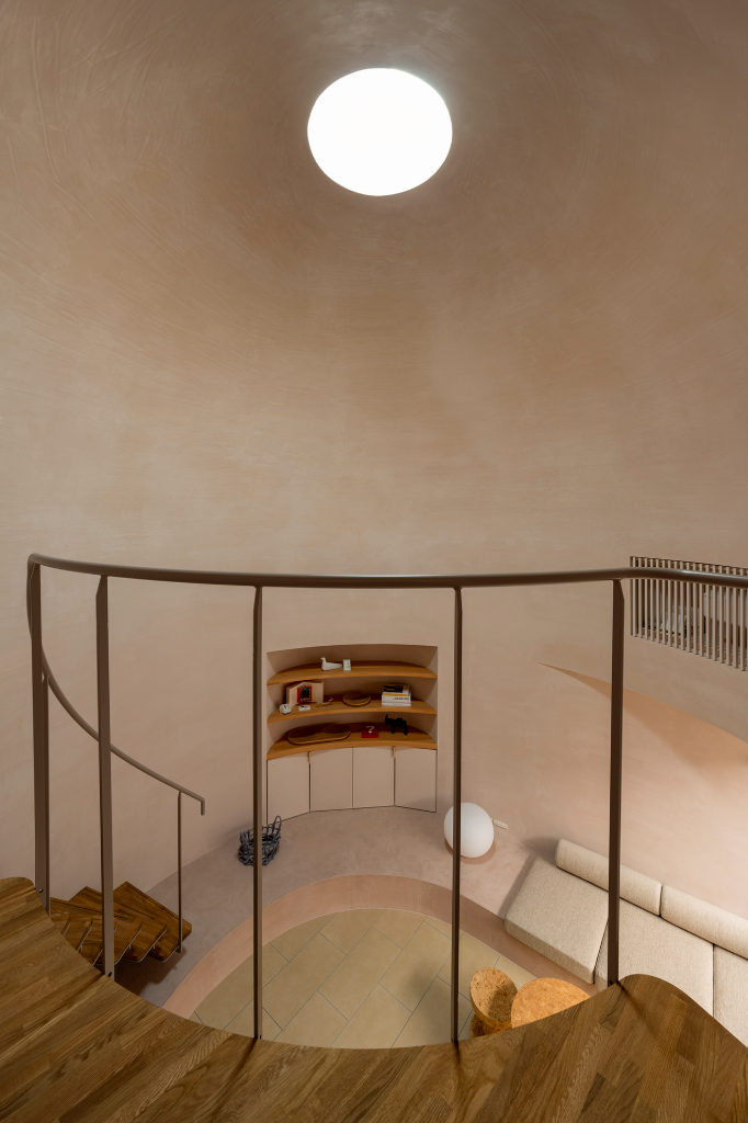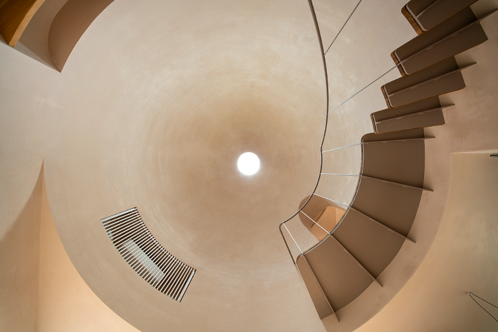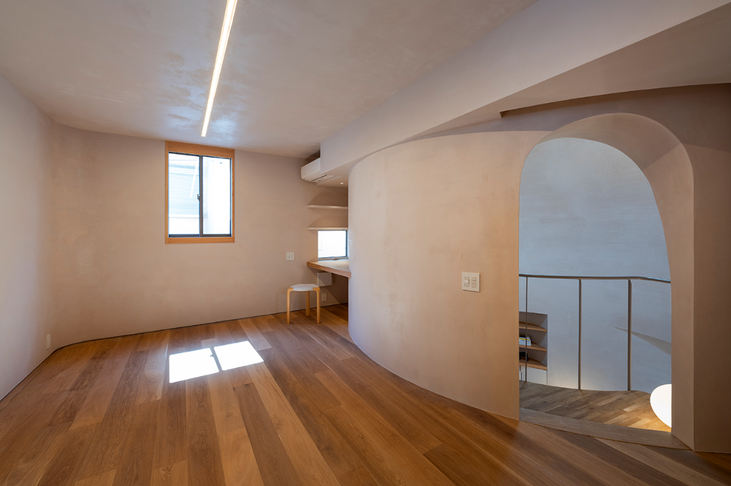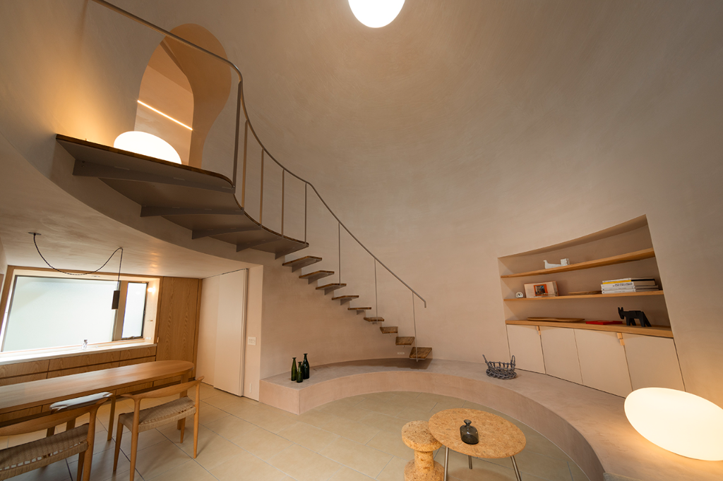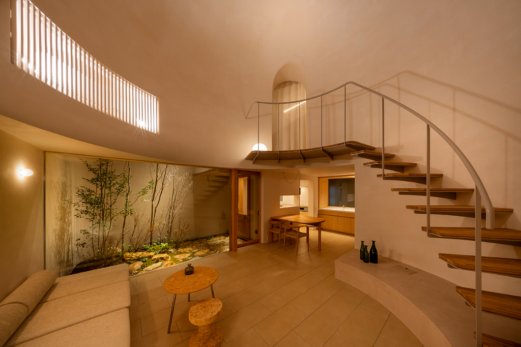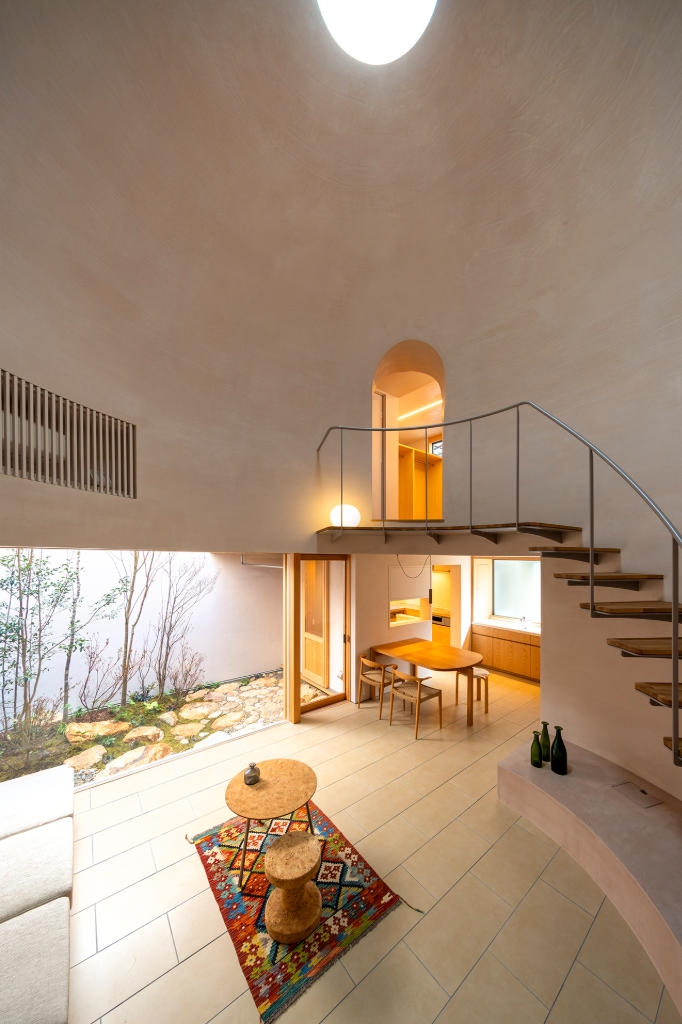 建築的佔地面積被放到最大,並形成了一個封閉的箱型結構。在內部,設計師們在北側角落設置了一個庭院,以便最大限度地利用自然光。庭院周圍是客廳、餐廳與廚房等活動空間,而臥室和浴室等私密空間則設在二樓。且這個住家的最大特色是其中央大廳,設計師希望該空間能夠溫柔的包容家人與前來拜訪的親朋好友,不會因為封閉而感到壓抑。大廳的圓弧設計與穹頂的巨大體積,能夠在聚集人群的同時保持舒適的氛圍,賦予空間無與倫比的包容性。