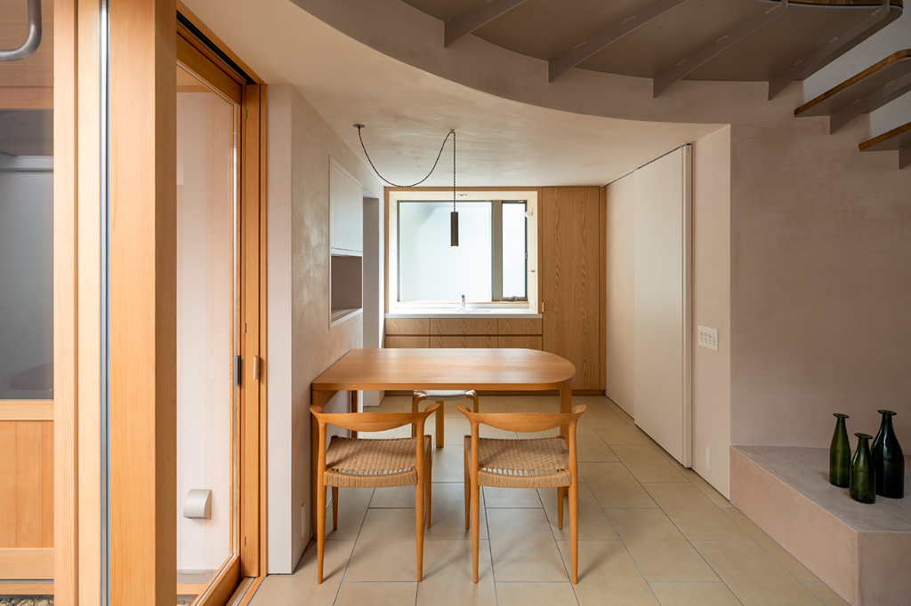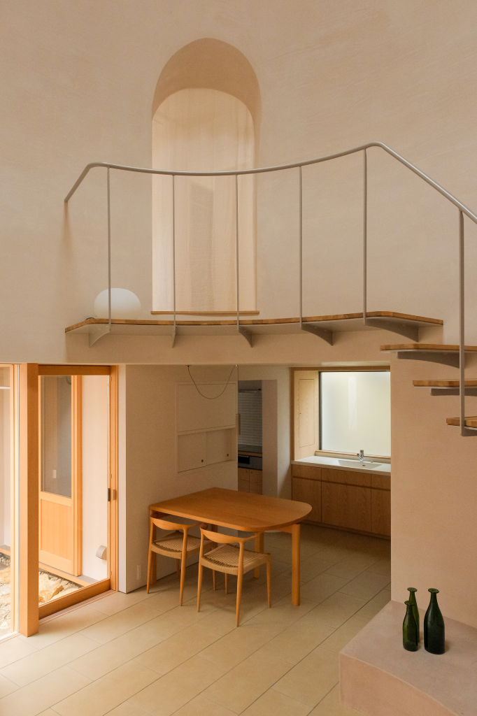 一樓的空間即使作為住宅也具有半公共特色,這種設計為狹小的箱型結構帶來了變化和層次。地板鋪設瓷磚,餐桌像是巷子裡的露天座位,還有延伸進入中庭的陽台,這些元素共同創造了一樓的獨特氛圍。天花板與牆壁均採用淡紅褐色的油漆,這樣做不僅增強了空間的明亮感,也讓光線顯得更加溫暖。同時設計師們非常重視採光與照明,為了創造出相對的明亮感,他們減少了大廳的開口,使整體光線變暗,但庭院落下的光線卻顯得格外動人。庭院中的光線像月光一樣從高處照射,以防止反射並充分展現植物的自然美。