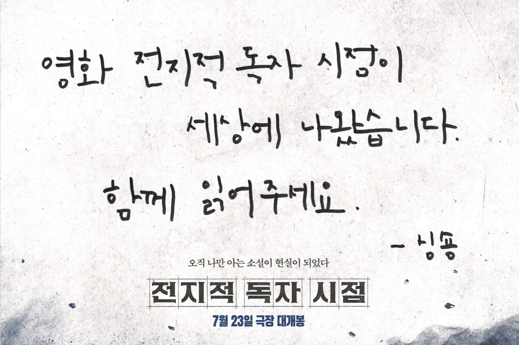 由《與神同行》金牌製作團隊傾力打造,年度話題鉅作《全知讀者視角》昨日(7/23)正式在台灣與南韓同日上映。原著小說作者sing N song為電影版背書肯定:「真的非常喜歡!」更在昨日親筆寫下祝賀訊息:「請大家一起觀賞吧!」。