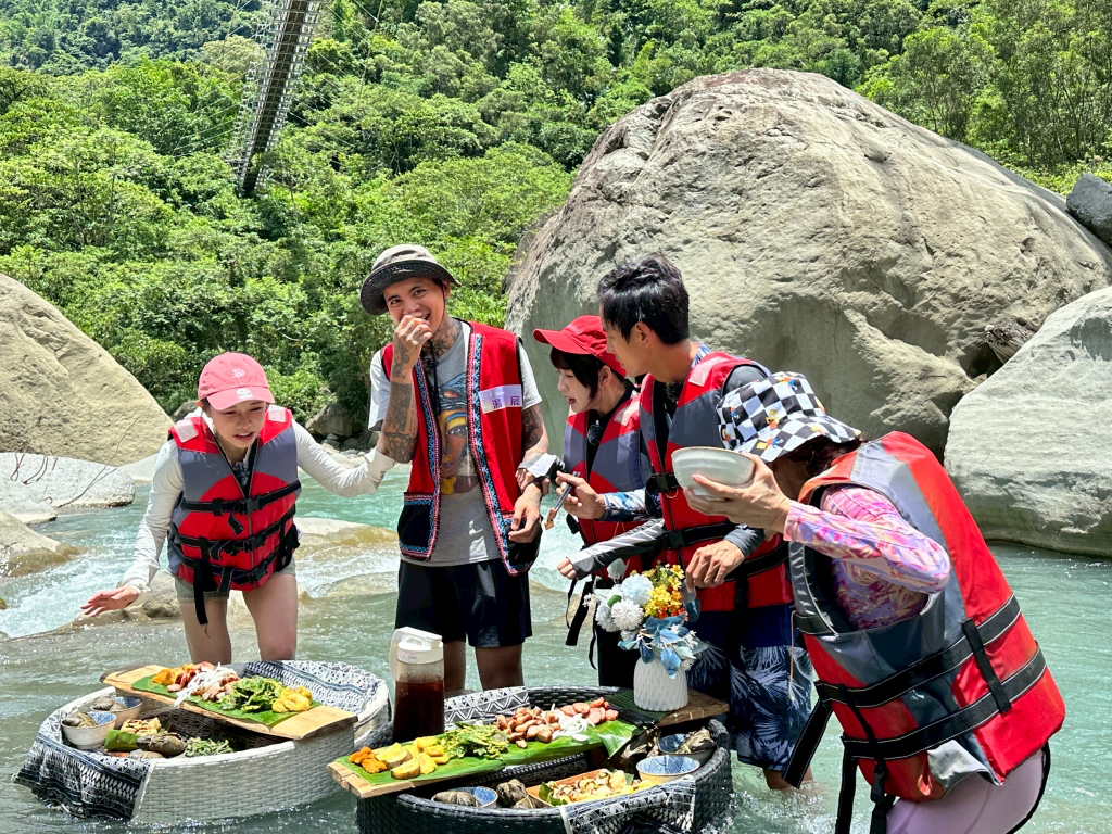 主持群與來賓經歷崎嶇的石頭路後終於抵達達娜伊谷溪,冰涼的溪水上竟飄來了「一桌美食」,富有特色的原民美食讓大家吃得津津有味,吃到一半楊繡惠竟大叫有東西一直撞他的腳,才知道原來這邊是鯝魚的故鄉;而調皮的籃籃假借鯝魚之名踢了阿翔一下,當場被阿翔抓個正著,全場笑到不行。