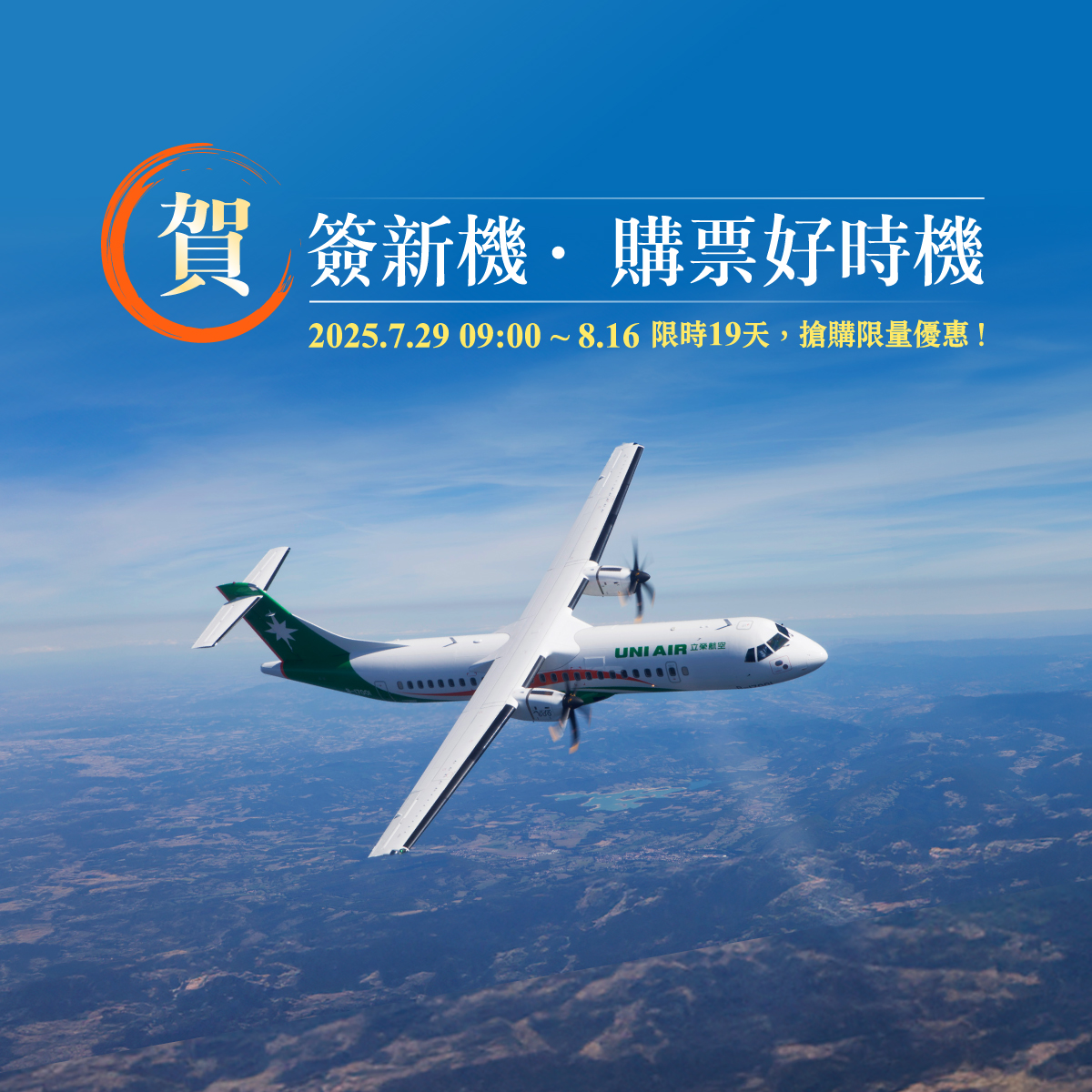 ▲立榮航空為慶祝與ATR簽訂購機合約,2025年7月29日上午9點起至8月16日止,特別推出「賀!簽新機·購票好時機」國旅限定優惠,更多資訊請上立榮航空官網或App查詢。