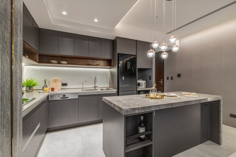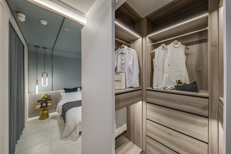 - 溫潤面材:全室鋪陳天然木皮,奠定溫潤的空間基調。