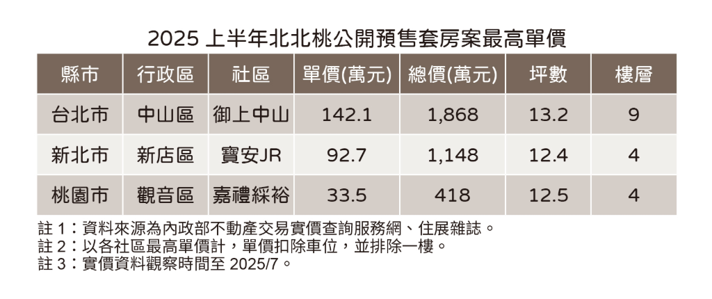 住展雜誌彙整北北桃今年上半年推出15坪以下套房產品,並為實價揭露最高單價案,分別是台北市中山區「御上中山」頂樓戶,僅13.2坪,每坪交易142.1萬元;新北市新店區「寶安JR」的4樓戶,12.4坪售出每坪92.7萬元;桃園市觀音區「嘉禮綵裕」4樓戶,12.5坪交易在單價 33.5萬元。