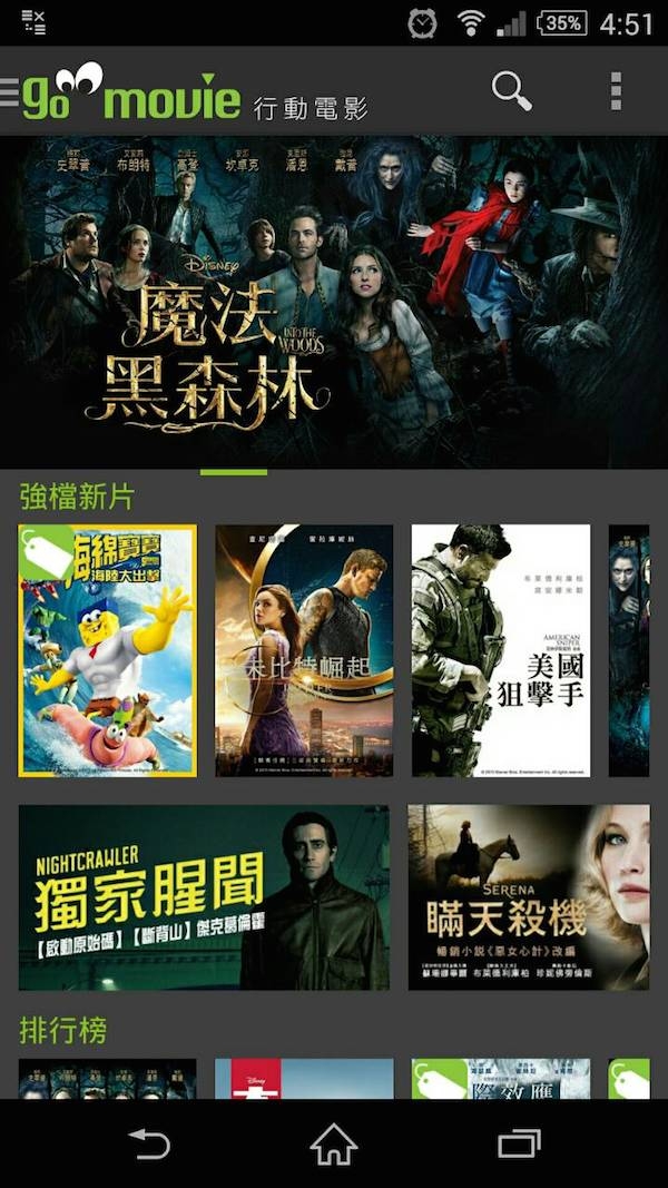go movie行動電影 不僅操作介面簡單、使用便利、豐富的影片陣容,提供最新、最強檔的好萊塢電影及最熱門國片、日本及歐美各類型影片,上架時間與實體DVD/藍光BD同步零時差。另外不定期將會有主題影片推薦,例如國際各項得獎作品推薦、適合節日觀賞的影片,讓消費者不用費心挑選影片,佳片不遺漏。