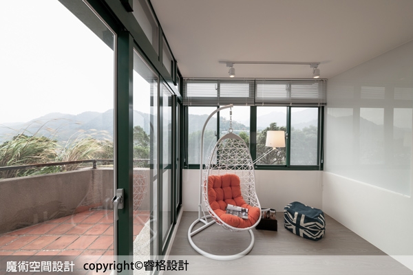 1.睿格設計陳柏宏設計師在面向景觀的大露臺旁,不做繁複裝潢雕琢喧賓奪主,而以簡約的休憩空間讓大自然湖景為入鏡主角,只在靠窗處安置水滴式吊籃慵懶沙發,成為渡假空間裡的大亮點。