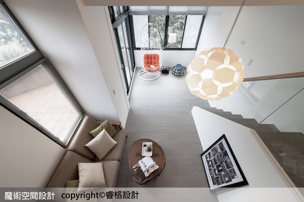 5.視覺穿透性的樓梯構化,以強化清玻璃和原木扶手延伸至上層臥房區隔間,整體空間清爽通透。