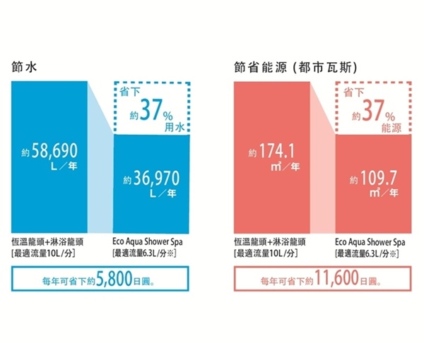 ECO Aqua Shower SPA具有更高的節約效能,一般四人家庭每年可省下約37%用水(相當於5,800日圓) 以及37%瓦斯能源(相當於11,600日圓) (註4)。