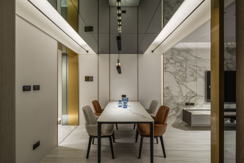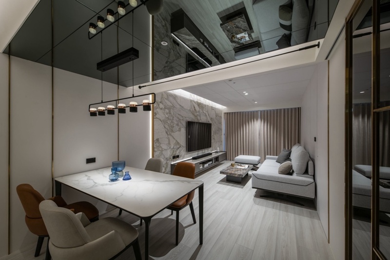 • 鏡頂挑高:餐區鏡面與鍍鈦天花搭配吊燈,延展垂直尺度,堆疊層次光感。