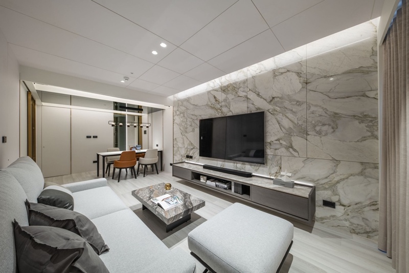 • 石牆主景:客廳主牆選用天然大理石,搭配黑白線性構圖,形塑沉穩大器的視覺焦點。