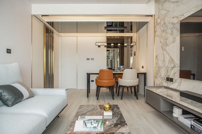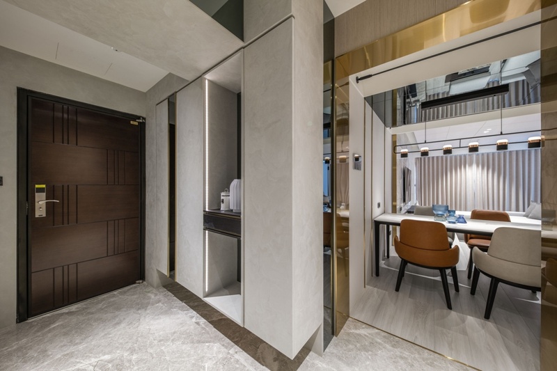 • 細節鋪排:鏡面與鍍鈦元素銜接門框與家具,增添視覺延伸與奢華氛圍。