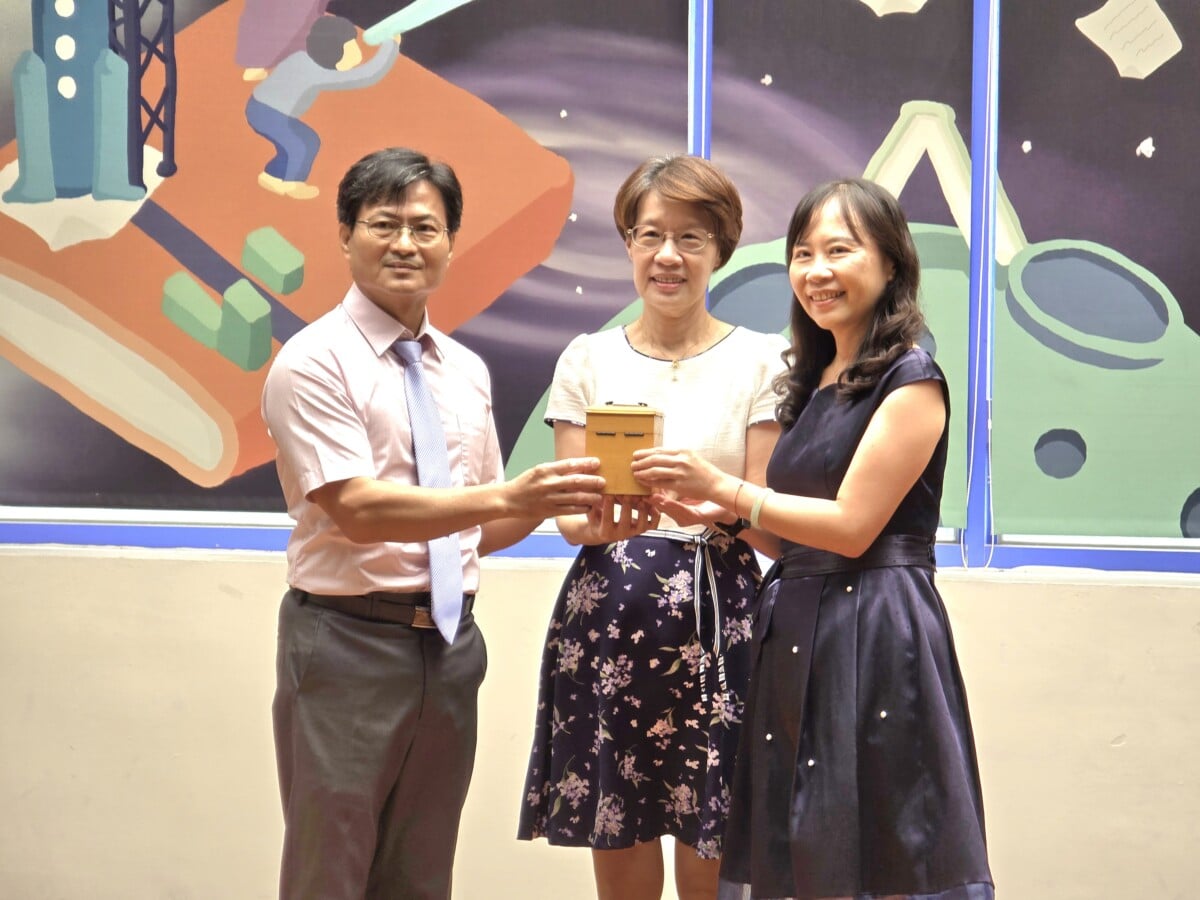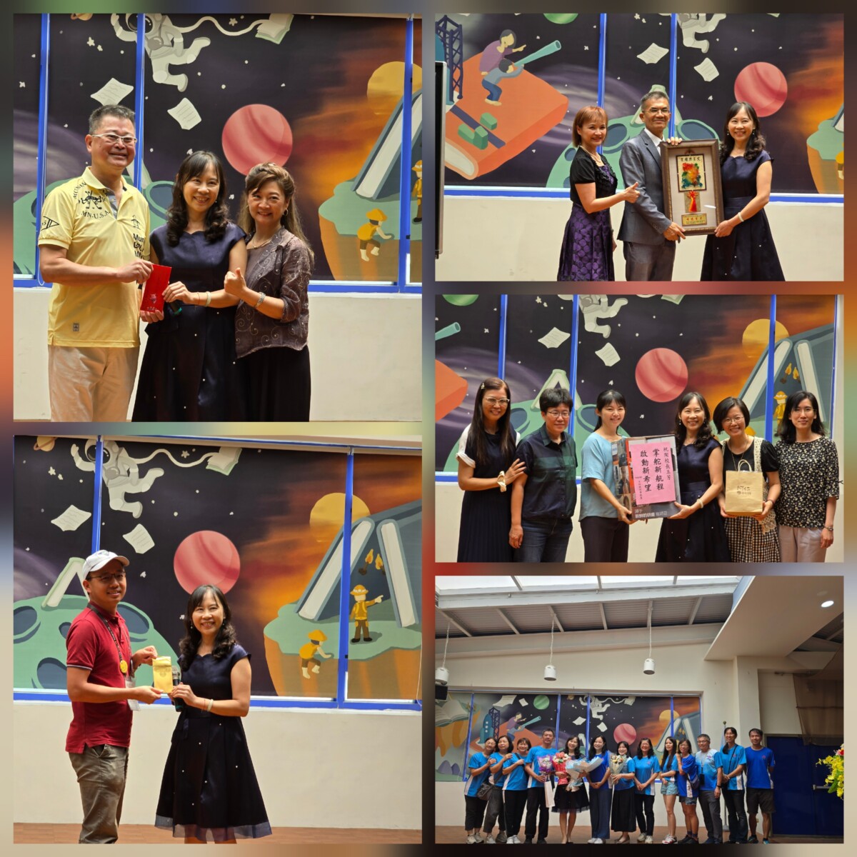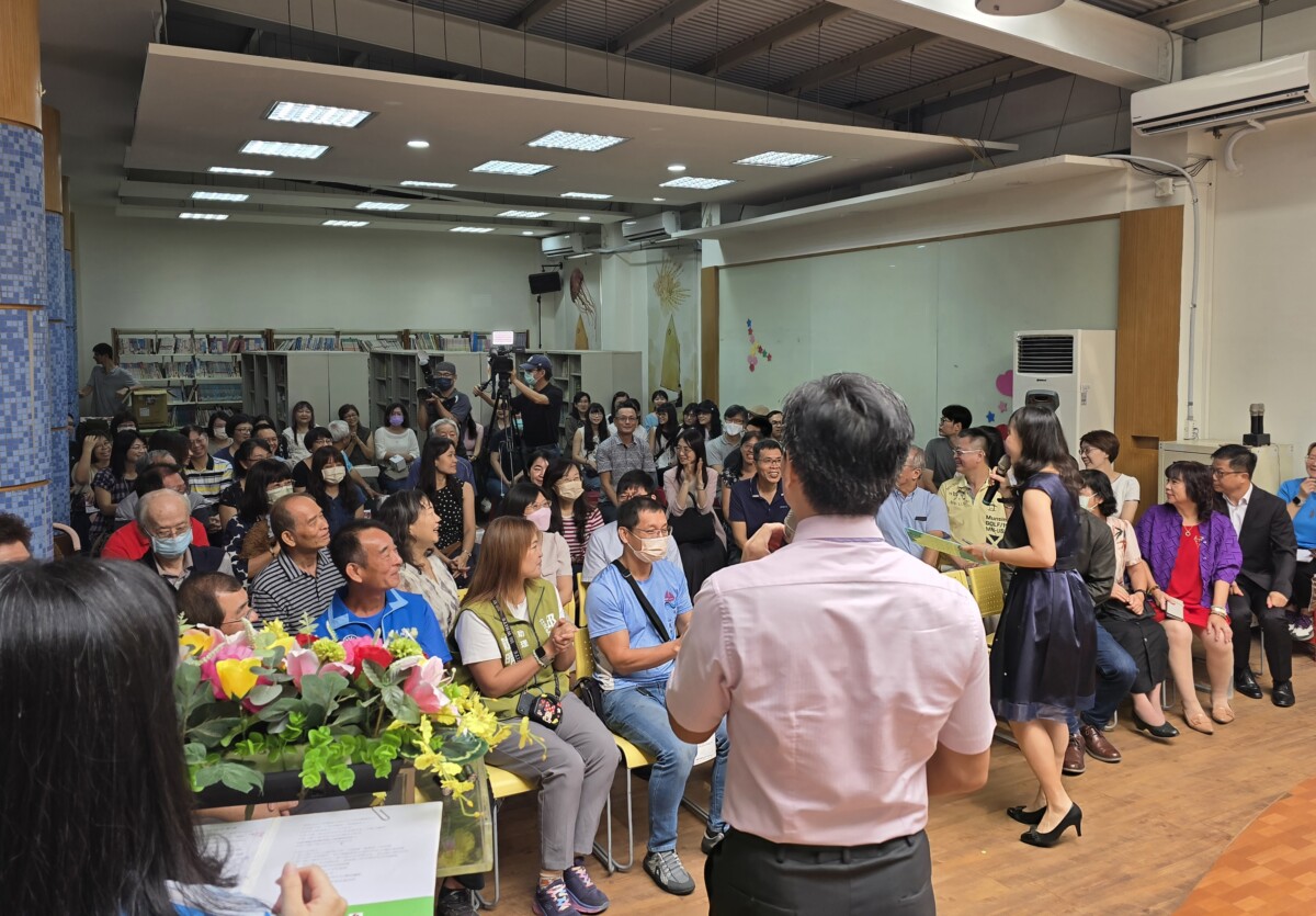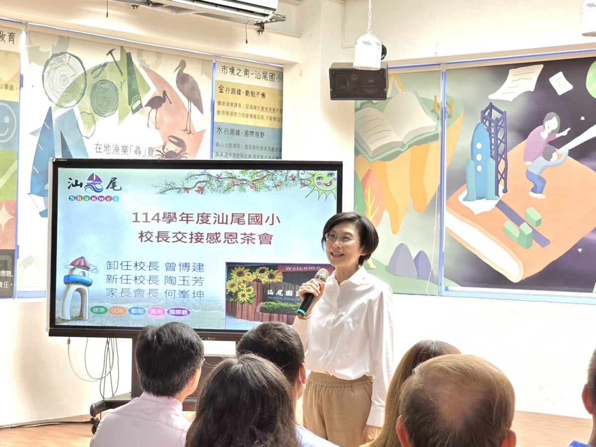 校務顧問、達綱興業總經理陳錫坤,也以親切幽默的口吻表達對陶校長的祝福:「親愛的陶玉芳校長,恭喜您成為汕尾國小的老大!這份職務看似四平八穩,實則需要十八般武藝。但我們都相信,只要陶校長一出馬,校園立刻風生水起!」他也期許校長帶著教育的理想,牽著孩子們的夢想,在這片美麗校園中播種希望、收穫成就。