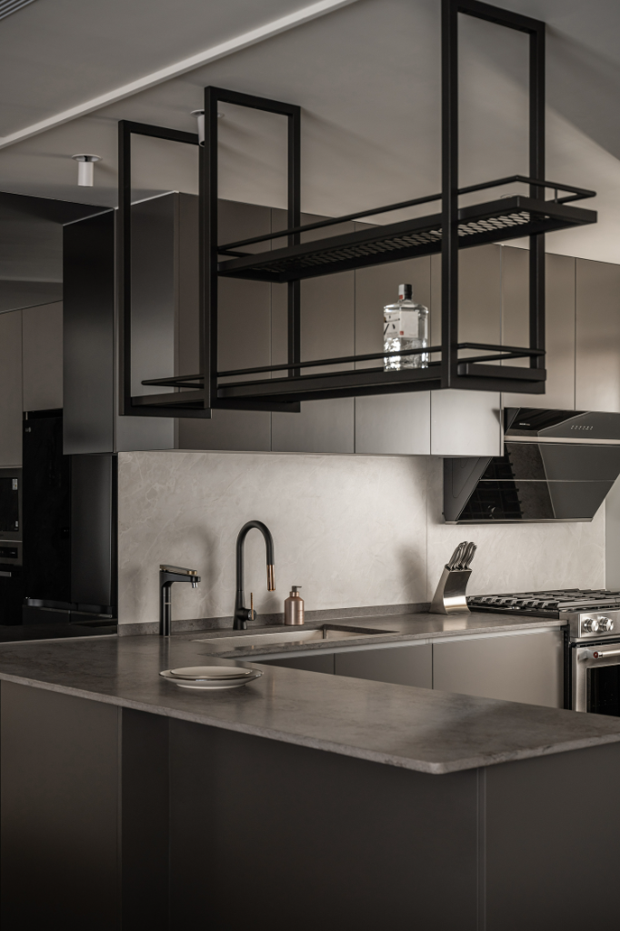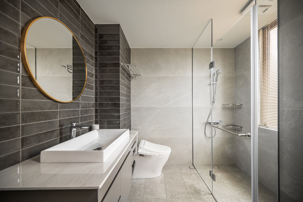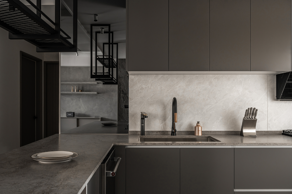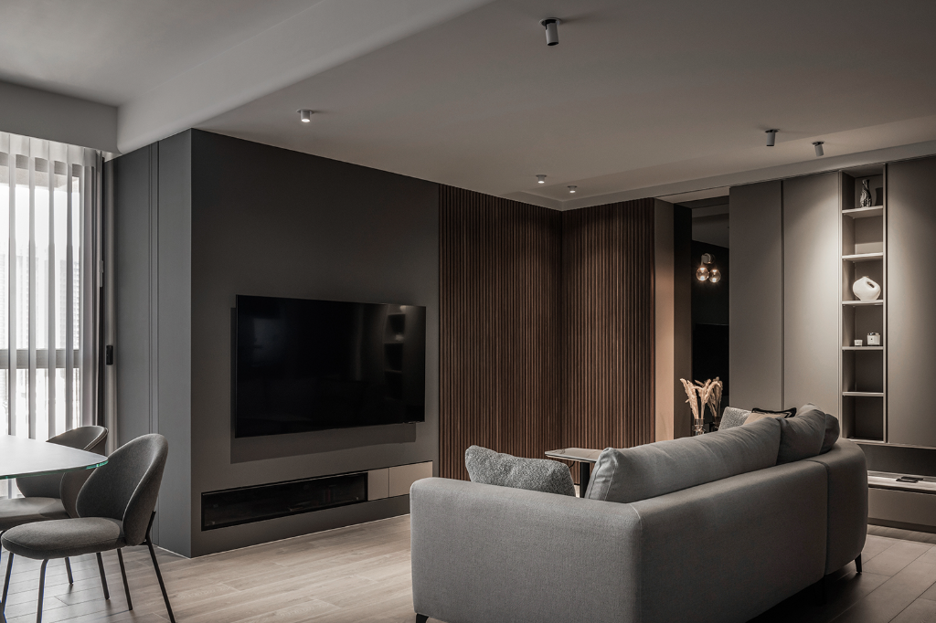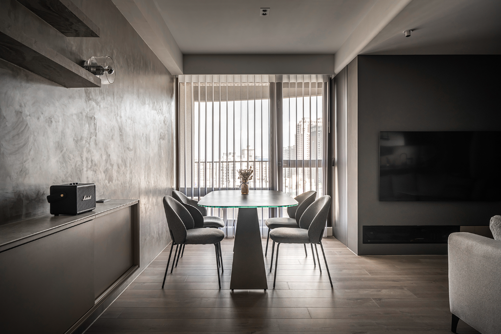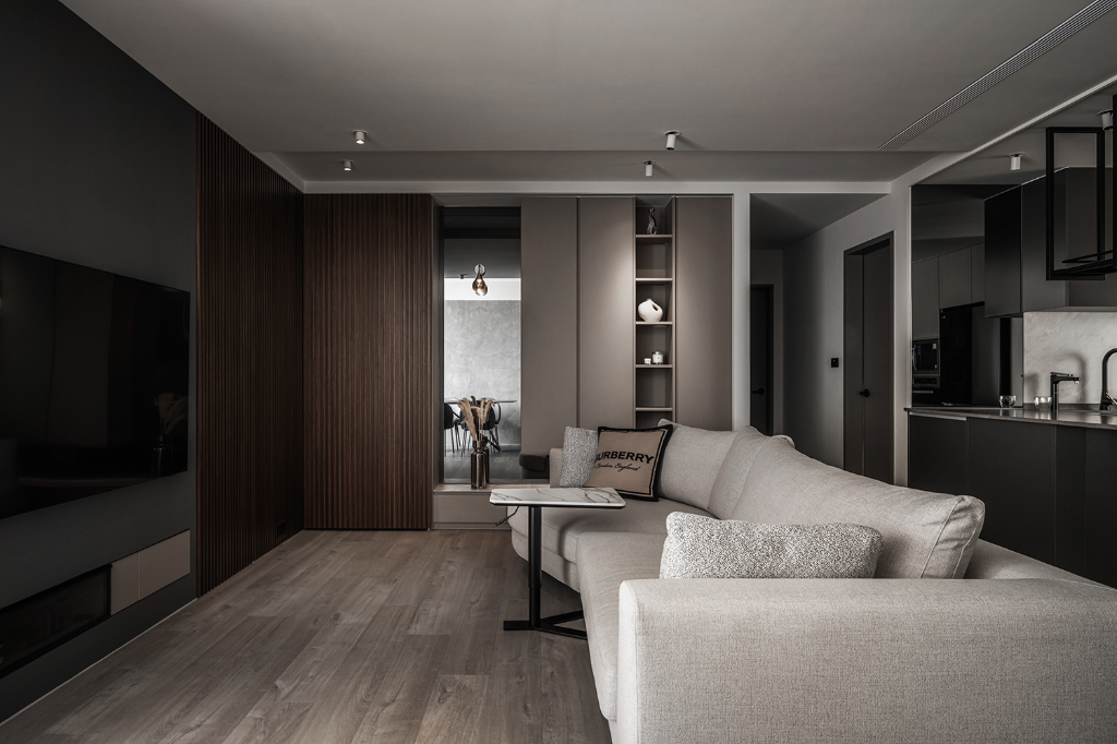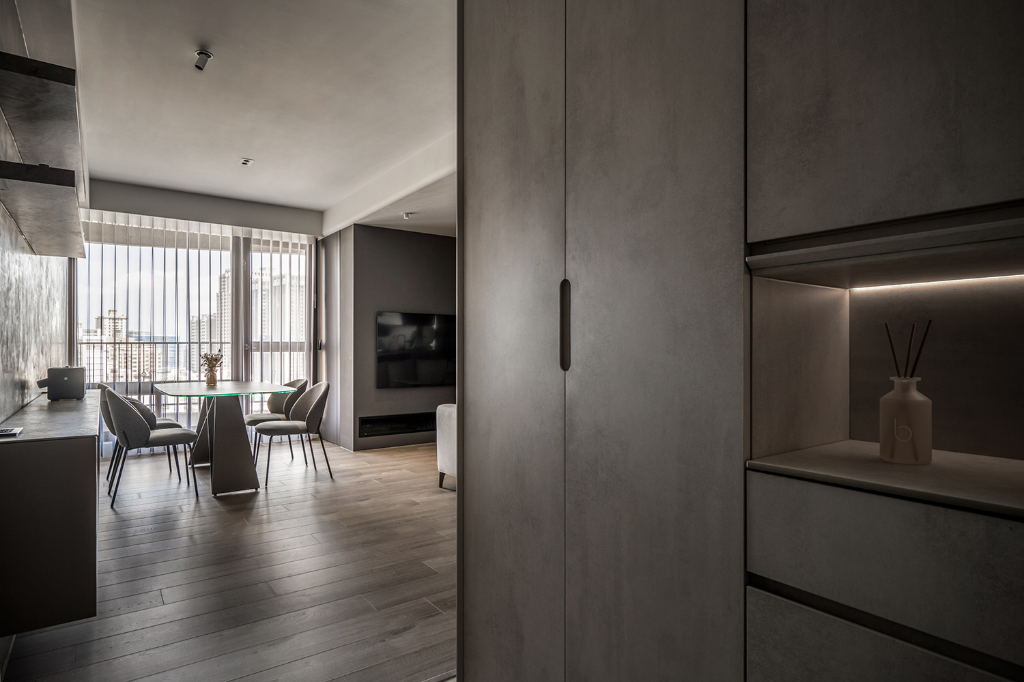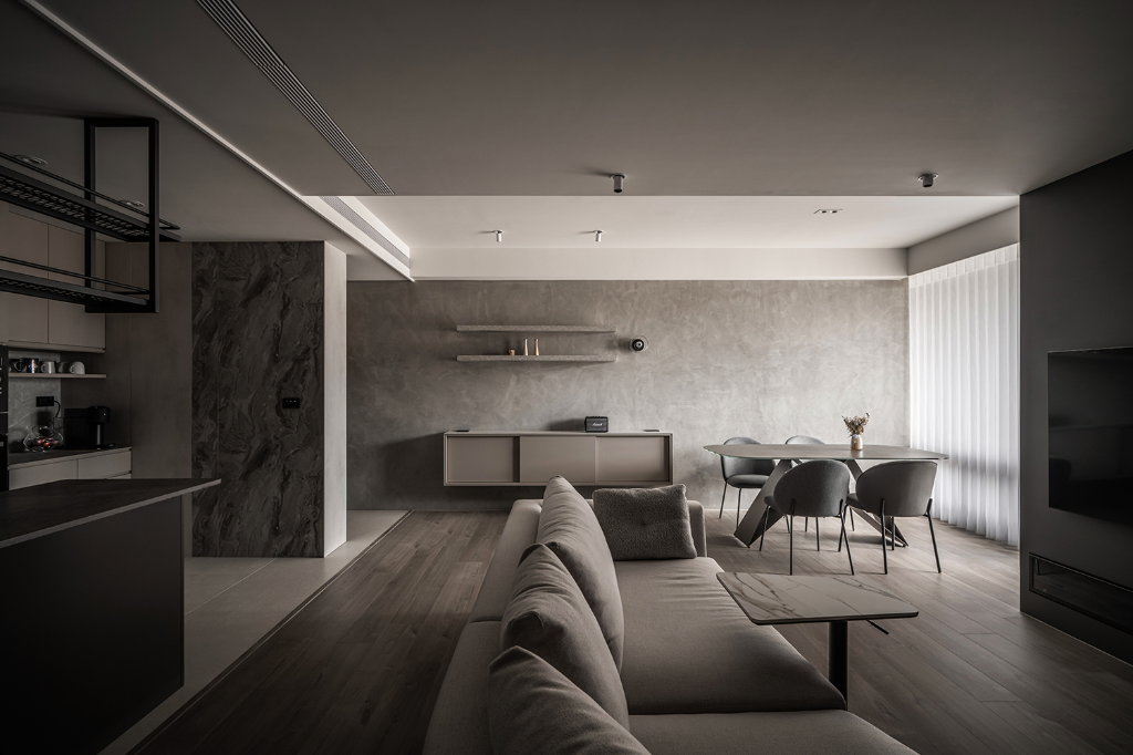 色調處理方面,設計師以偏暖灰階作為主軸,避免出現冰冷、刻板的灰系印象。玄關與廚房鋪設義大利石紋磁磚,增添沉穩厚度;私領域則以深色超耐磨木地板界定,形塑溫潤且內斂的居所性格。更細緻的是,設計師配置部分黑鏡作為端景,不僅藉由反射作用擴張空間感,同時引導光線深入內部,使過往昏暗的角落也一樣柔和明亮。