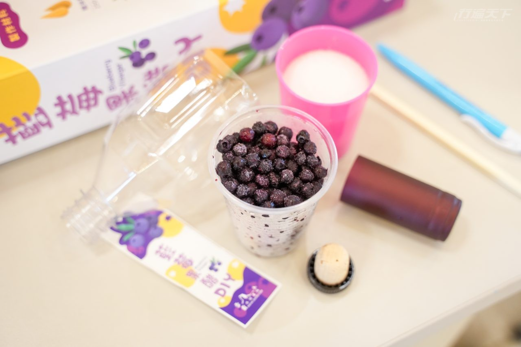 為提高製作成功率,農場以靜置法讓遊客體驗果醋DIY,使用農場自產的小藍莓凍果搭配糯米醋,並加入白糖改良風味,過程中必須隨音樂搖晃瓶身,將糖粒融於醋中,動感有趣。