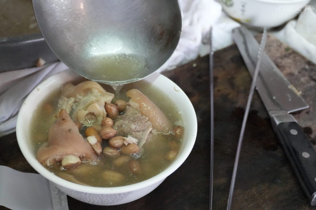 我總愛在人多的時候,拜託外婆煮上一鍋豬腳湯。新鮮花生與煮到熟爛的皮肉,一定要多人共享才夠美味,因為豬腳湯若要好喝,料就得下得夠足。長時間燉煮的湯,依然保持清澈,卻帶著些許油花。起鍋後撒上少許香菜與胡椒粉,豬腳的油脂被花生吸收,而花生的清香也釋放進湯裡。對我來說,豬腳料理的最佳版本,始終是家裡親手煮的那鍋花生豬腳湯。